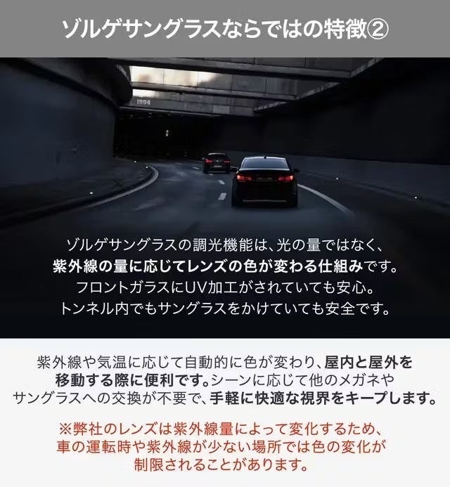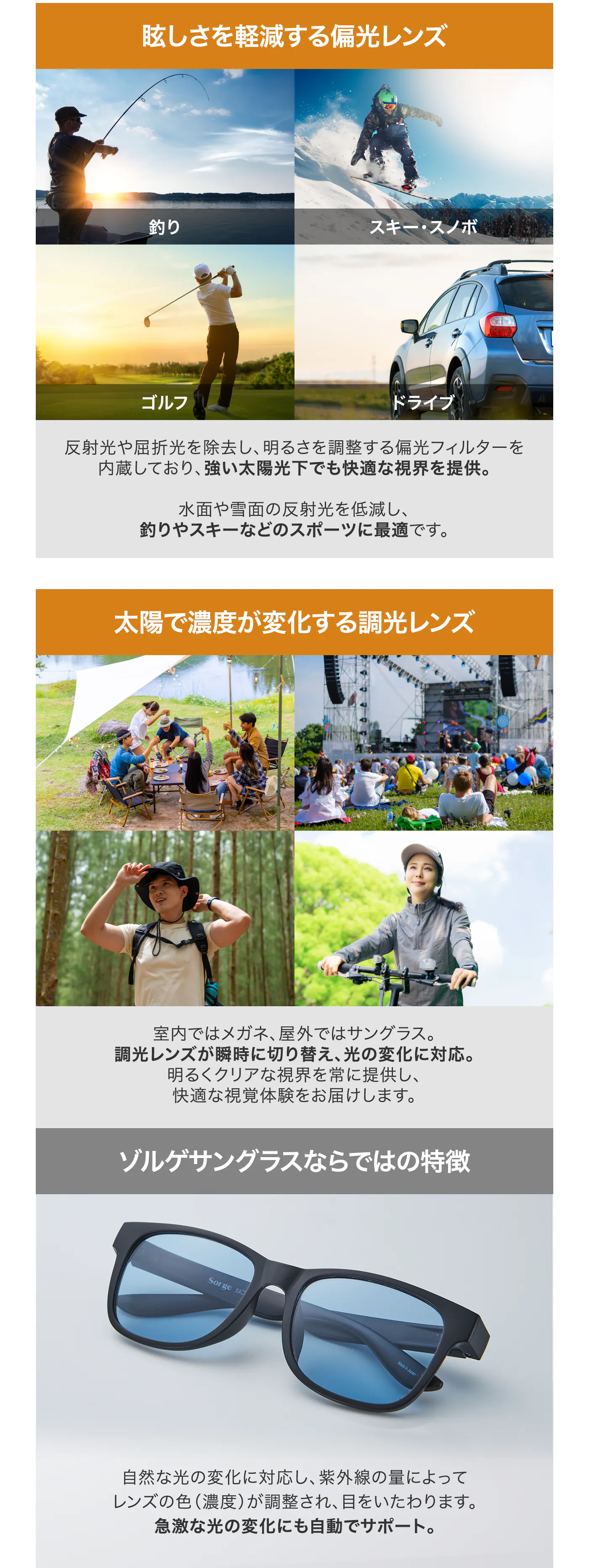 ゾルゲサングラスは、「調光・偏光・UVカット」全てを1つのレンズで実現!
