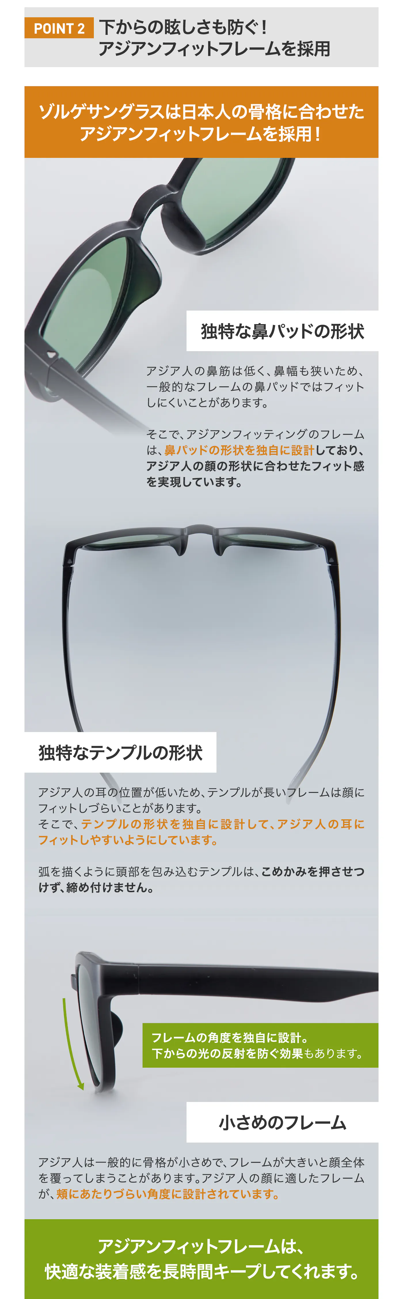 A2.基本的には、ユニセックスです。アジア人の骨格にフィットするアジアンフィットフレームを採用しています。ラバー加工により小顔の方にもフィットしやすくなっています。