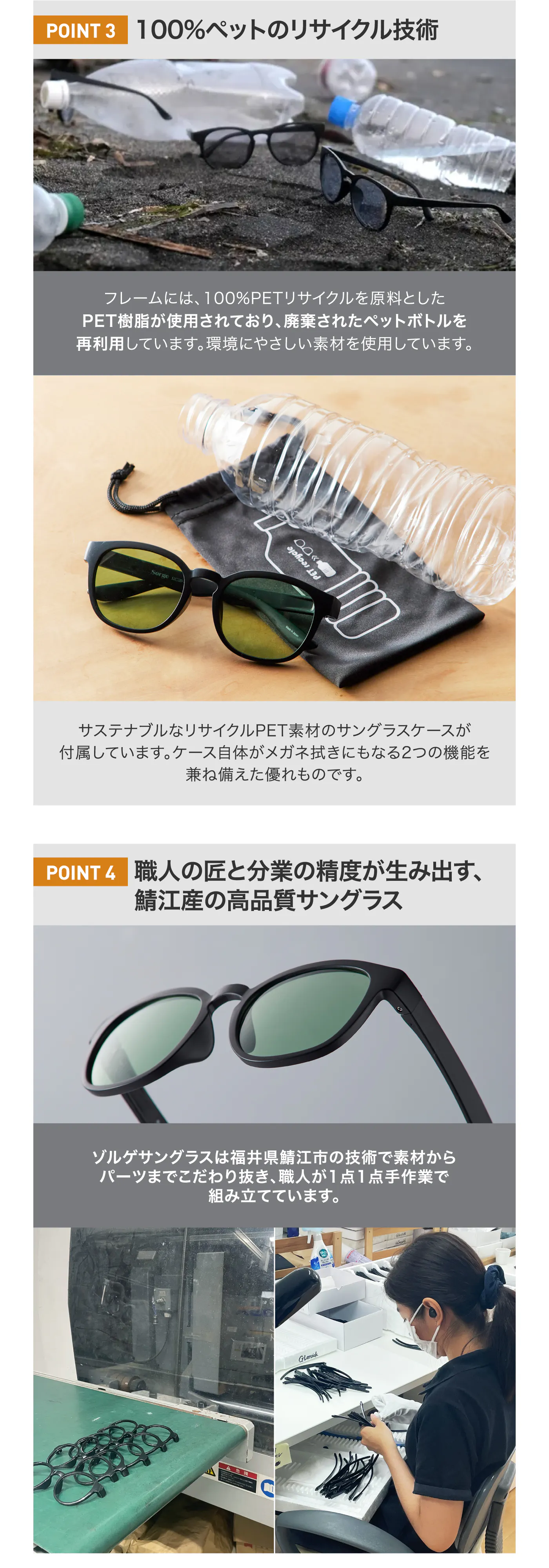 A3.弊社のサングラスは、廃棄されるペットボトルを再形成しているため、表面に白いゴミのようなものが、現れる事があります。また、鼻の部分には、材料を注入するための注入口があります。鼻の部分には、当たらない位置になっておりますのでご安心ください。