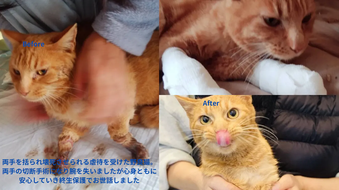 私たちは、虐待、野良、保健所からの保護を主としています。私たちは、動物を二度と不幸にさせないことを第一に考え、これまでどんな病気も諦めず惜しみない医療とケアで治療しています。