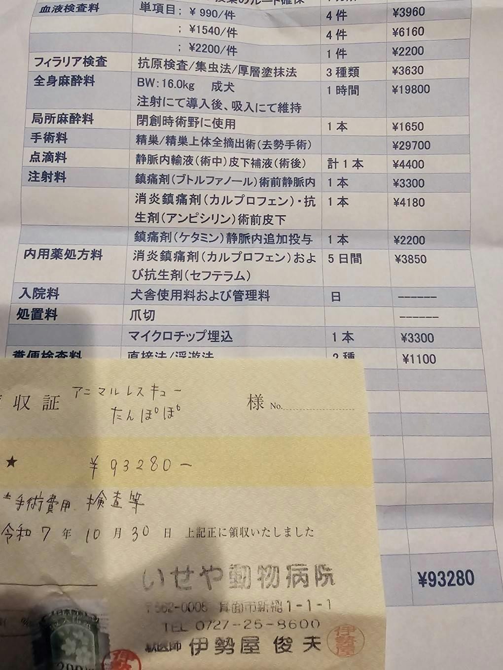去勢手術と共に血液も内臓も検査しましたが狼爪の伸びた爪が食い込んでいた以外は何も問題なく安心しました。