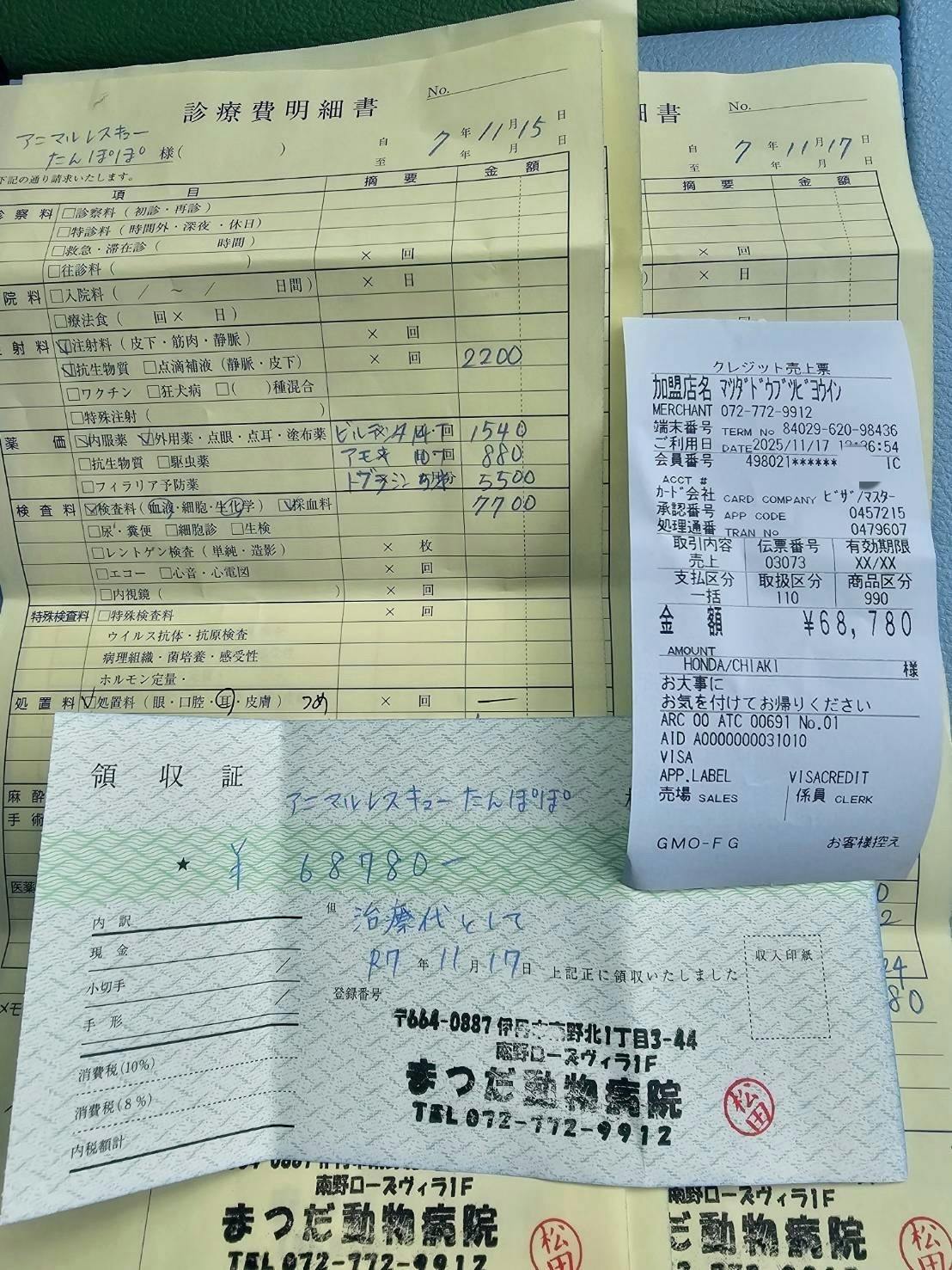 多頭飼育崩壊からレスキューして入退院を繰り返すオカッパちゃんと野良から保護して目やにと鼻水が治らないガンコちゃん、保健所からレスキューした犬のツブちゃんの残りの医療にきました。