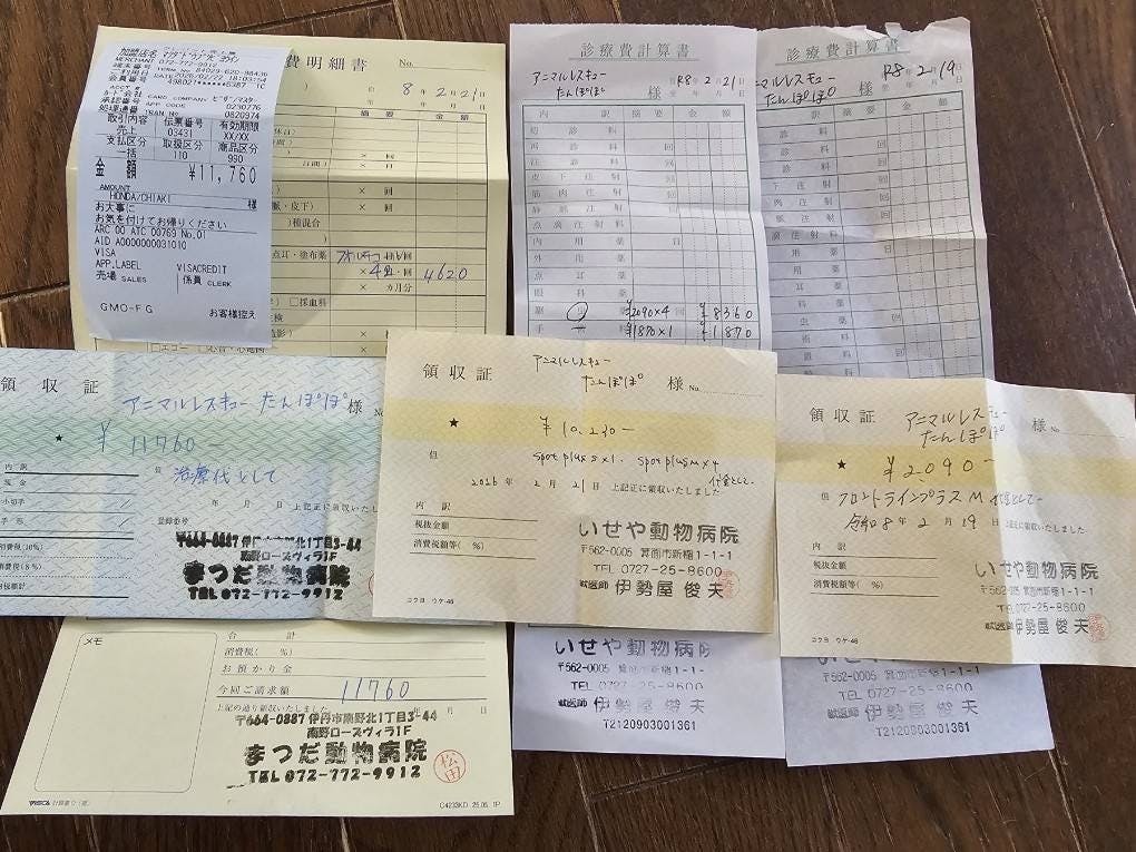 昨日と一昨日の医療費と医療フード購入の領収書です。