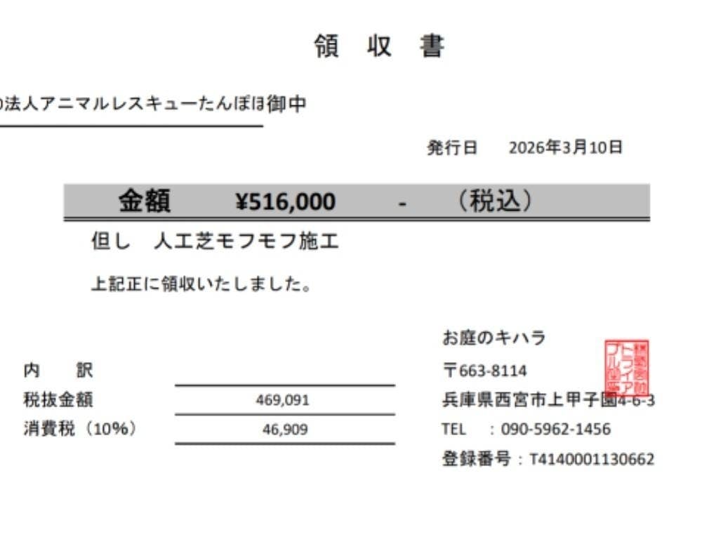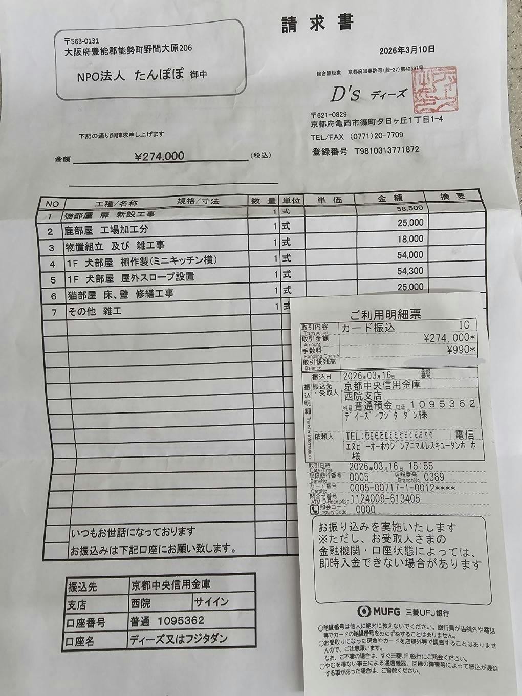 犬部屋、スロープなどの修繕費と花壇撤去して駐車場を広げた工事費用の領収書です。猫舎工事と犬部屋防音工事の支払いは全て終わった後になります