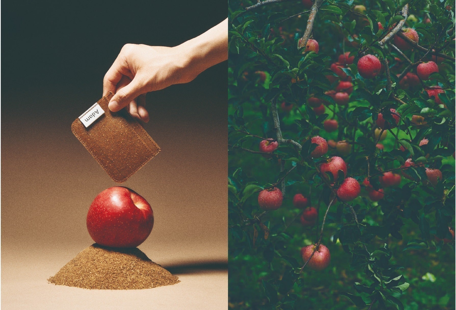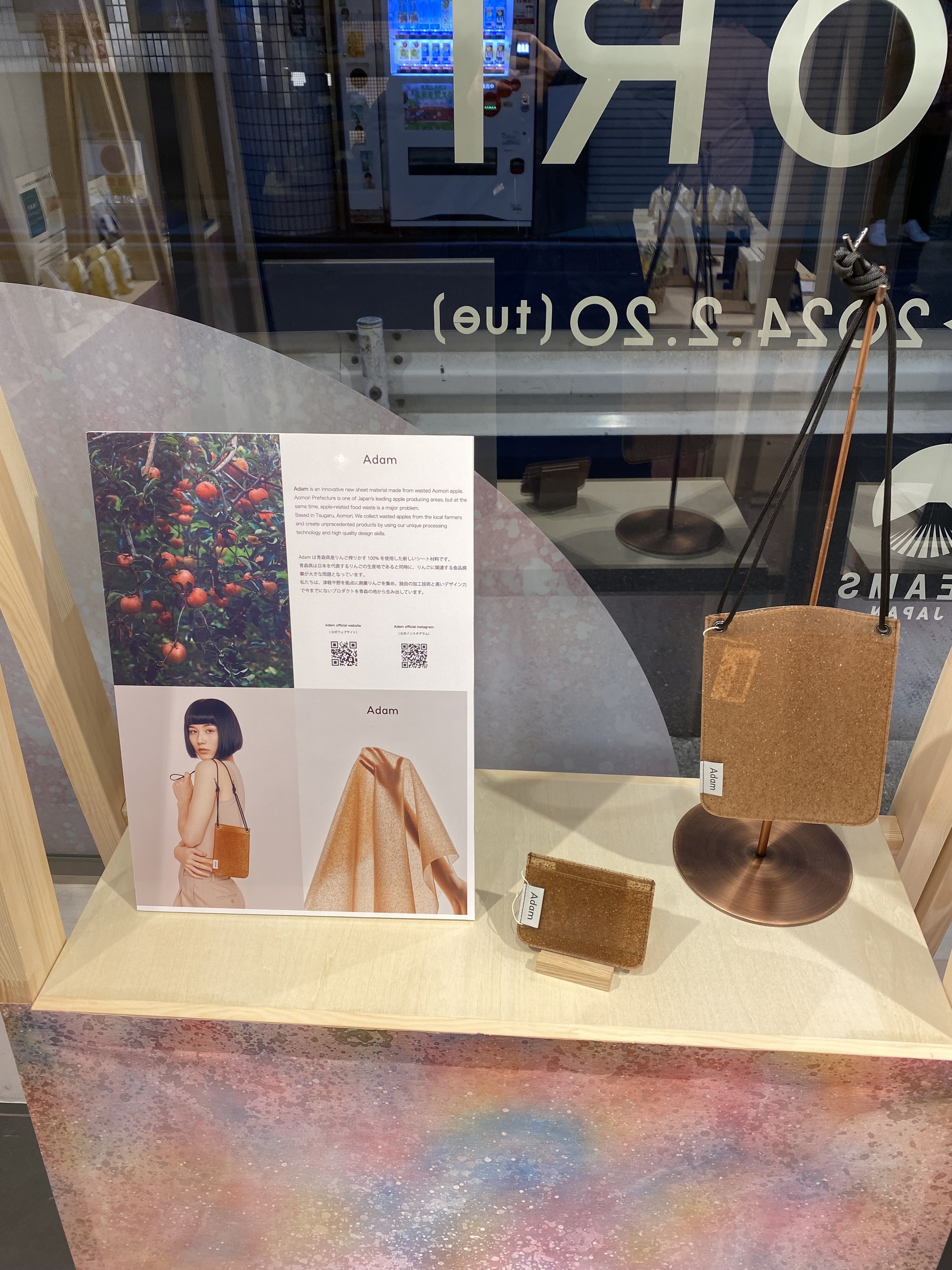 「Adam」は独自の加工技術で半透明のシートにりんごの搾りかすをそのまま封じ込め、素材本来の美しさや立体感を残しています。 この「原材料が見える素材」はりんごの種や皮の不均一な表情を通して、この素材がどこから来たのか、なぜ作られたのかという物語を五感で感じ取ってほしいと思います。