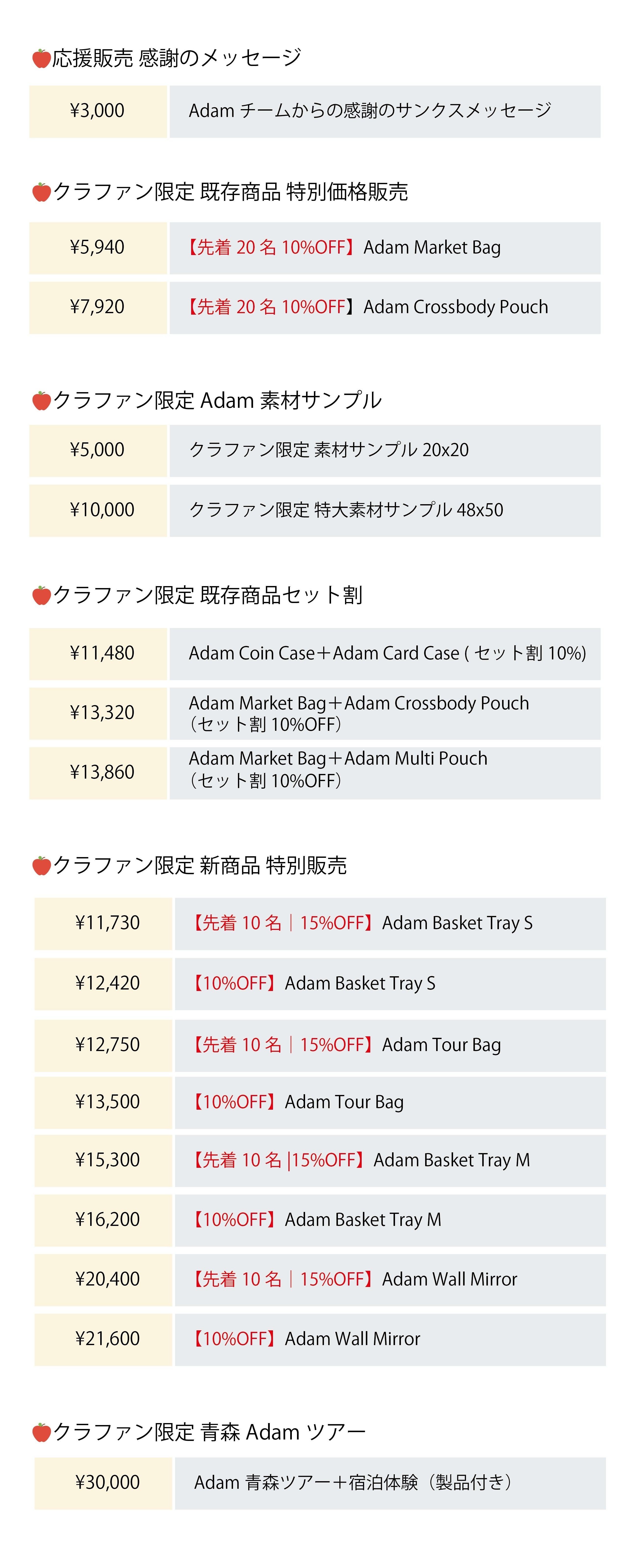 独自の新商品開発費用に充当します。具体的には「Adam Sheet 」(新年度版)「Adam Wall Mirror」「Adam Basket Tray」の3点となります。さらなるラインナップの製造と「Adam」の新しい付加価値の創造を試みます。