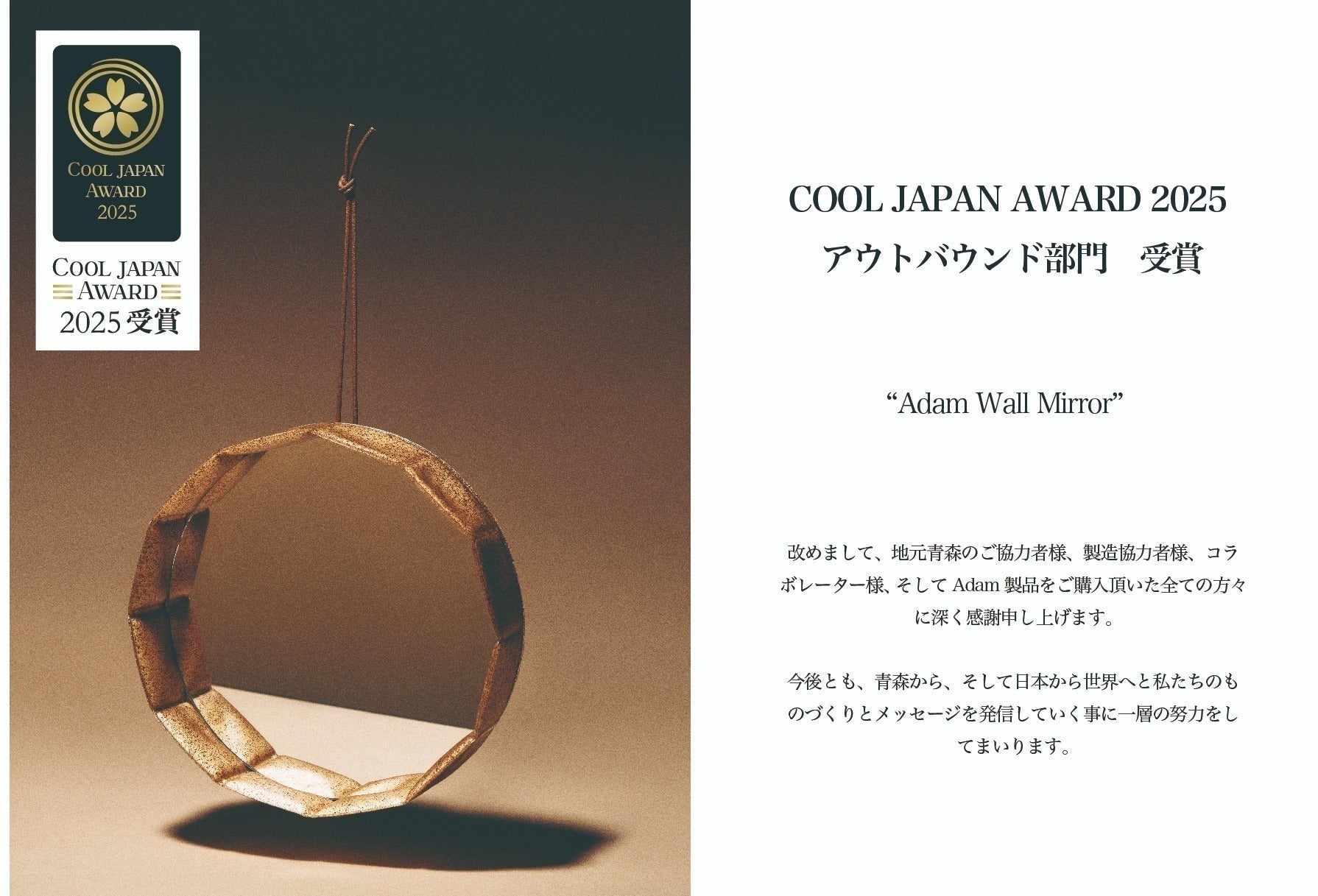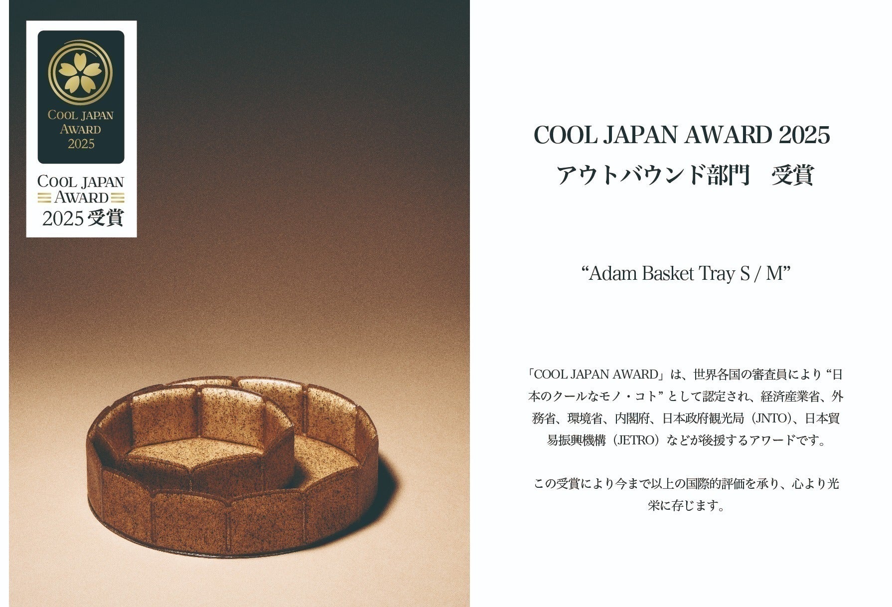 そして、2025年8月にはWall Mirror, Basket Tray, Light といったインテリアアイテムが「COOL JAPAN AWARD 2025」 に選出。