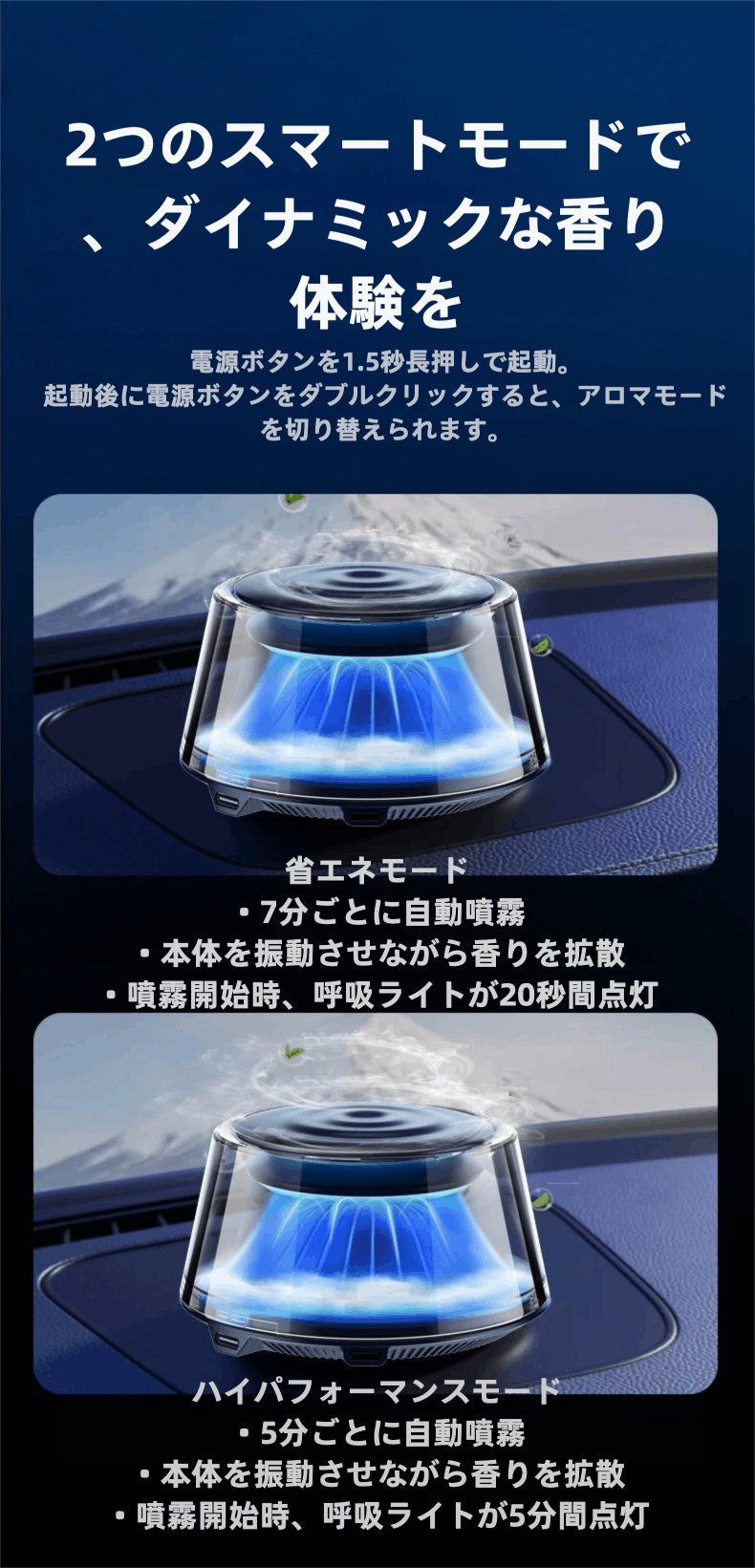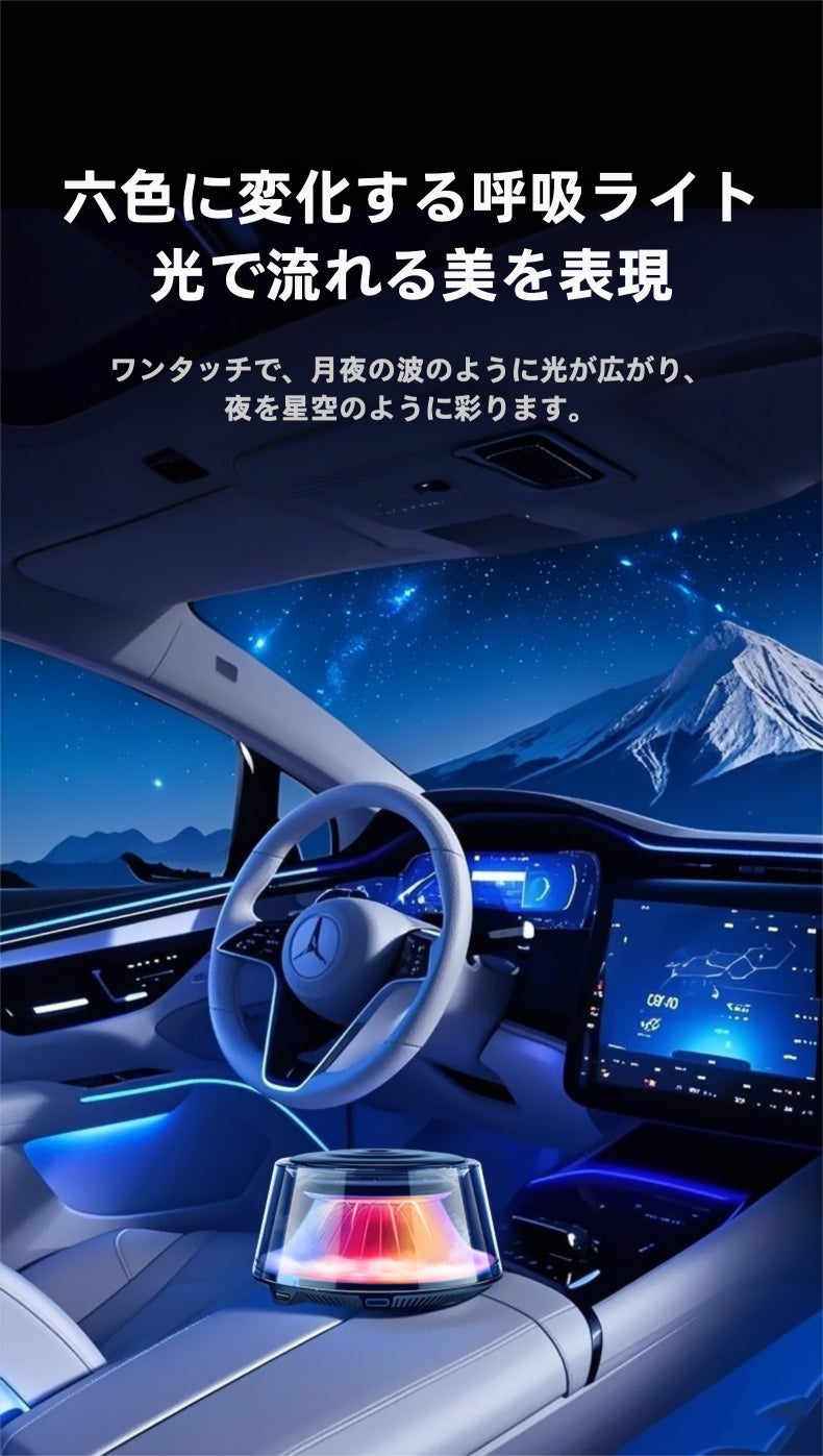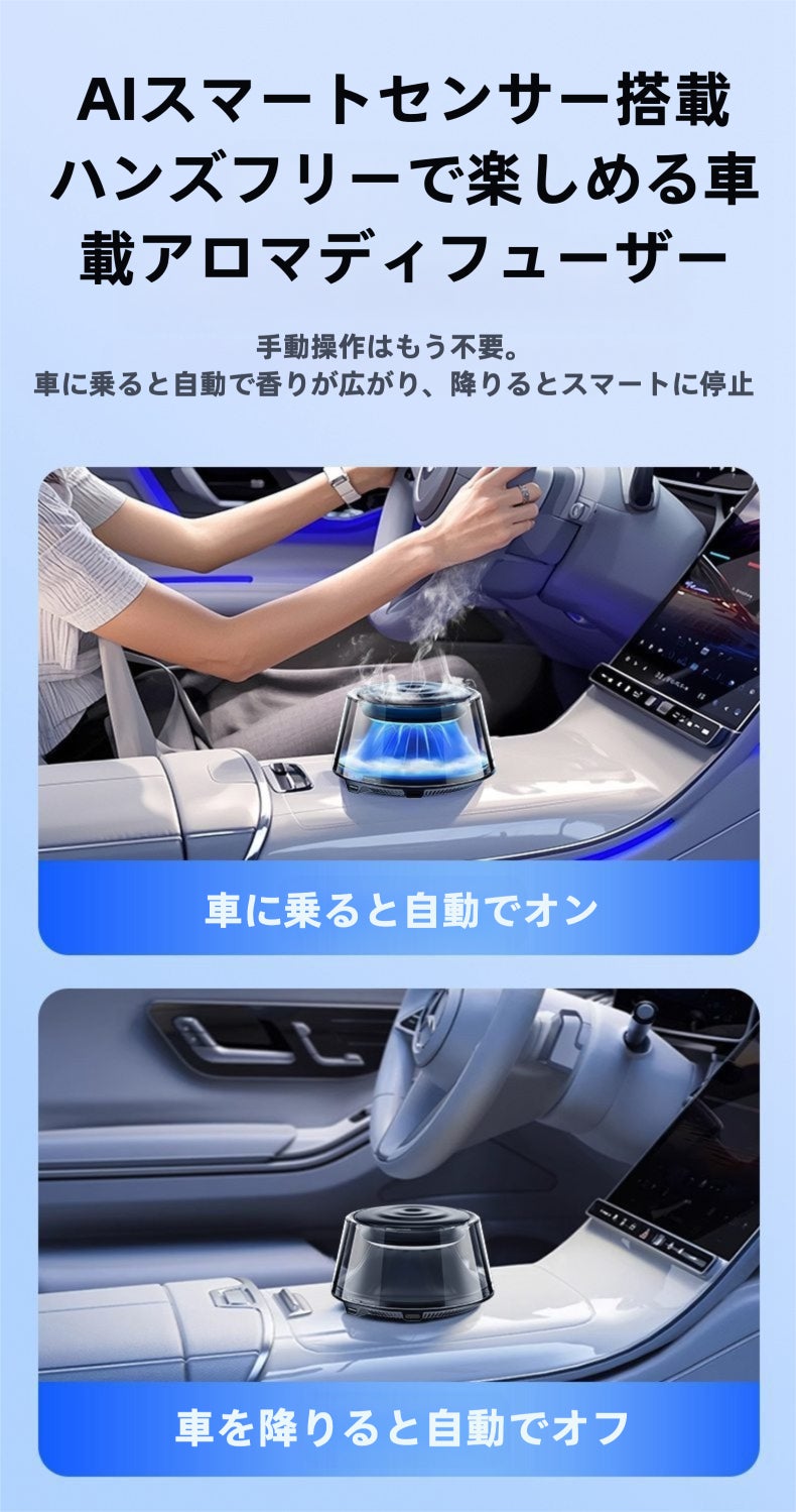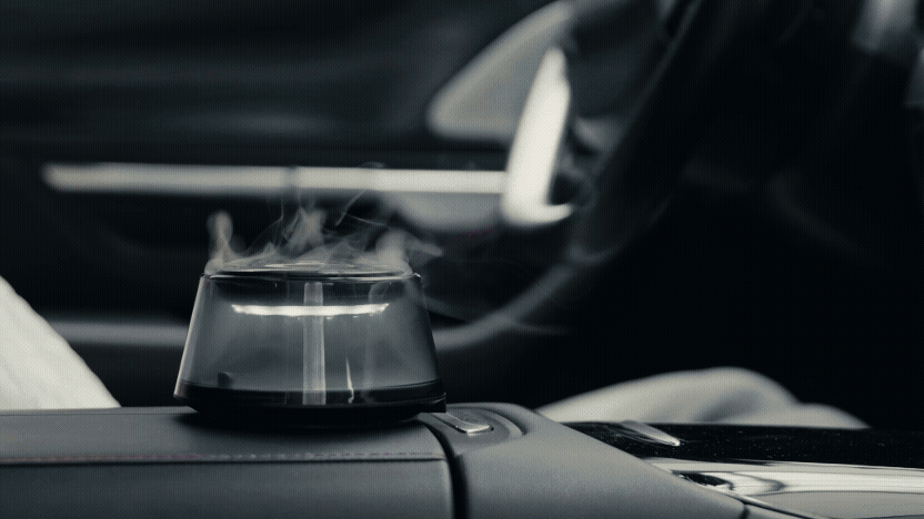 AIが自動で香りをコントロールし、美しいミストと呼吸するような光が車内を演出