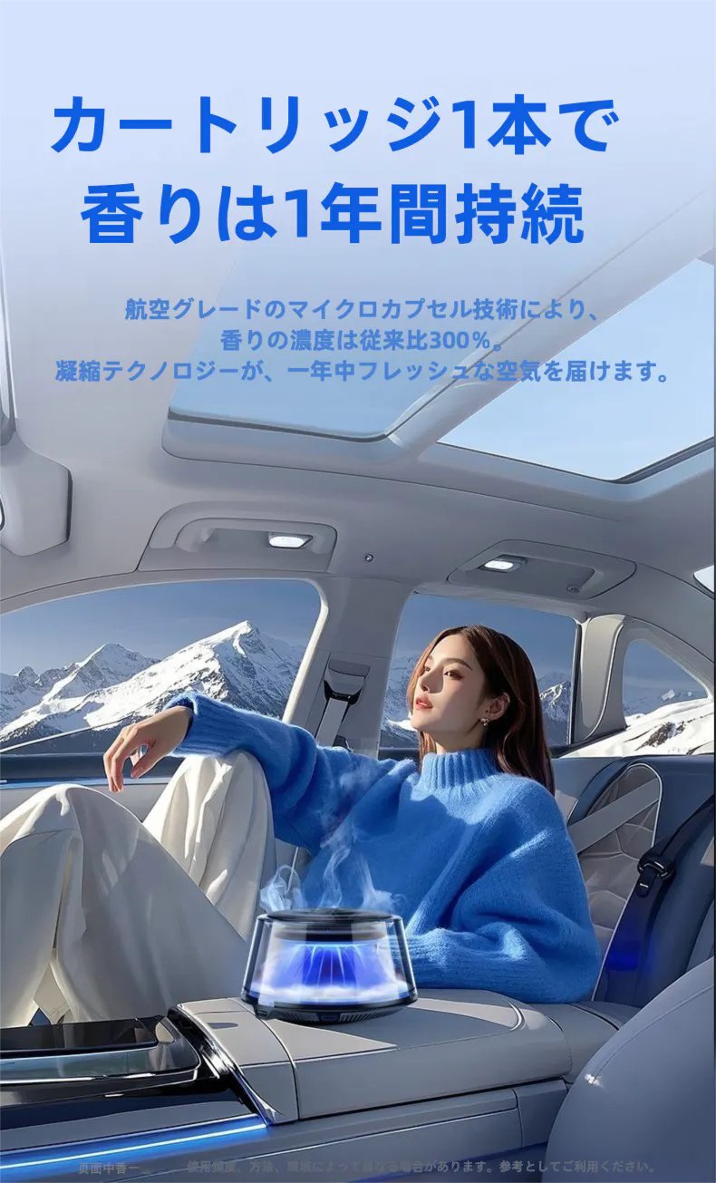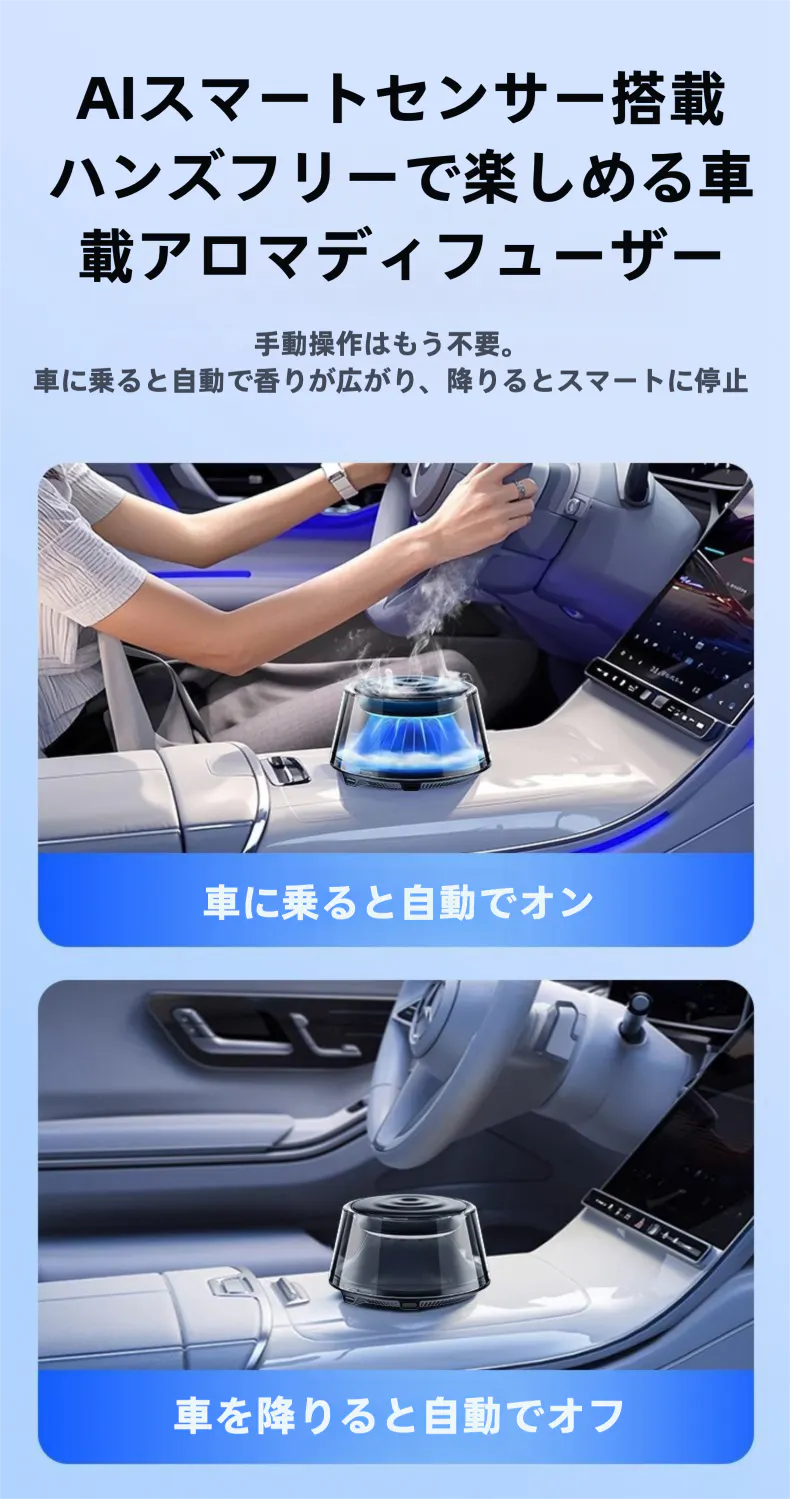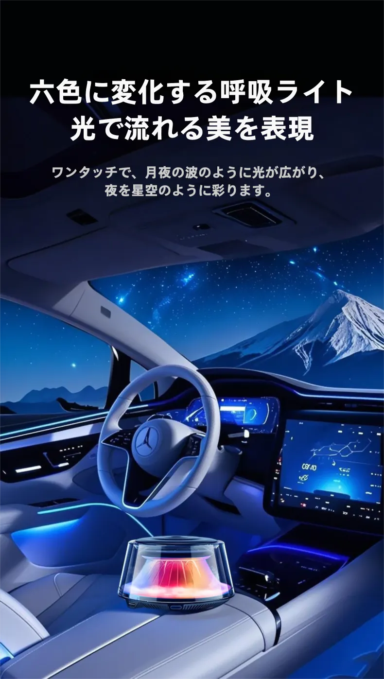 AIが自動で香りをコントロールし、美しいミストと呼吸するような光が車内を演出。
