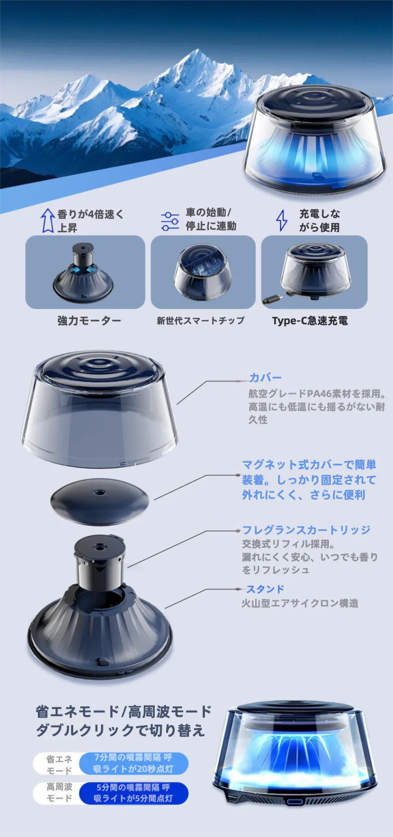 交換式カートリッジで一年中フレッシュな香りを楽しめ、安心・安全な素材を採用しました。