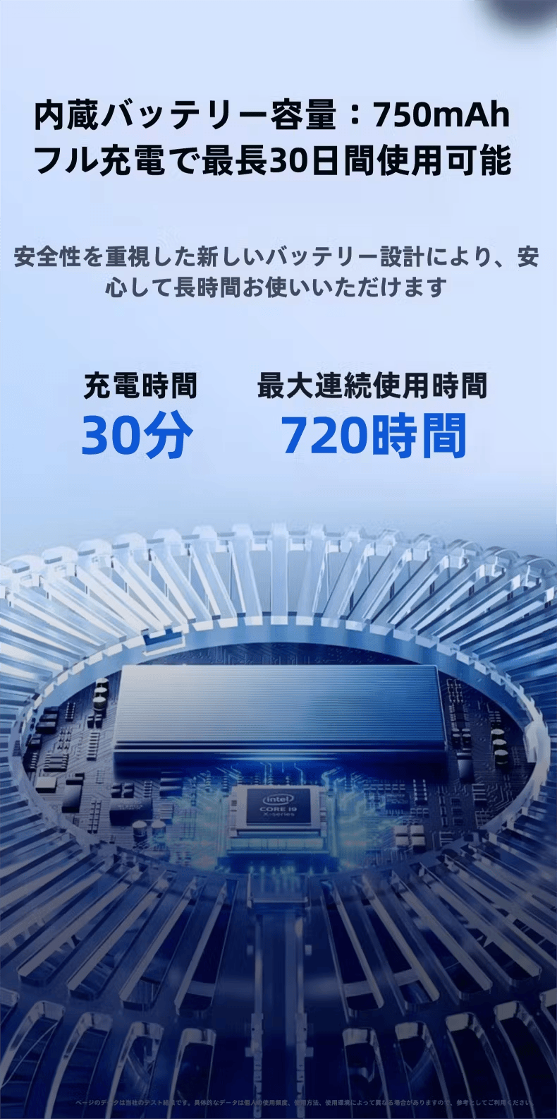 本日は、製品の「内蔵バッテリー性能」についてご報告いたします。本製品には 750mAh のバッテリー を搭載しており、フル充電で 最長30日間(約720時間) の使用が可能です。