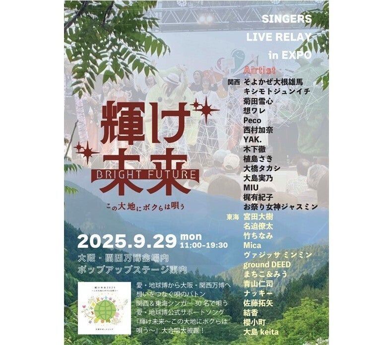 この企画は、一般参加催事として採用されたもので、関西&東海の音楽アーティスト26組31名が集まり、「輝け未来」の合唱と、それぞれのライブリレーをお届けします。