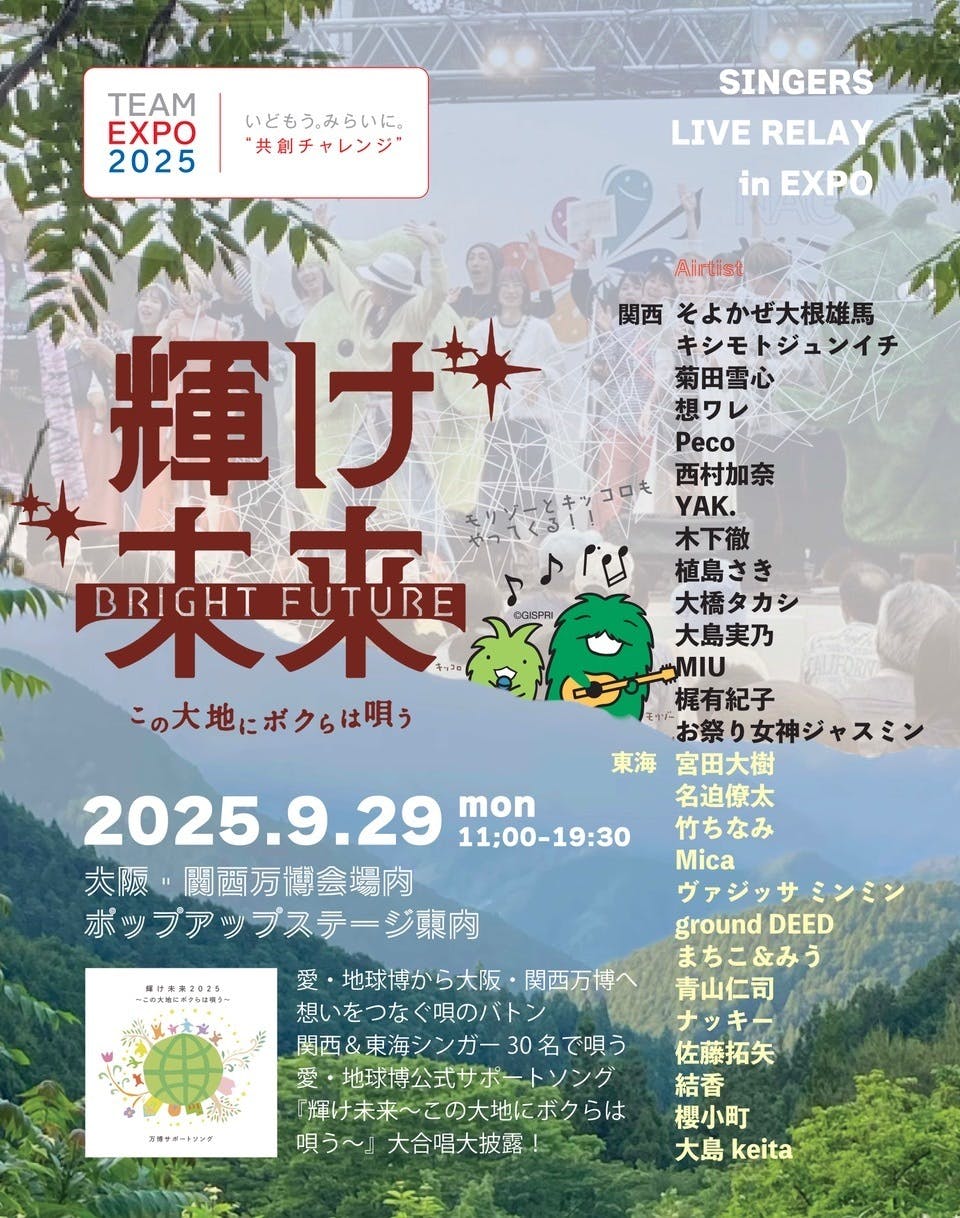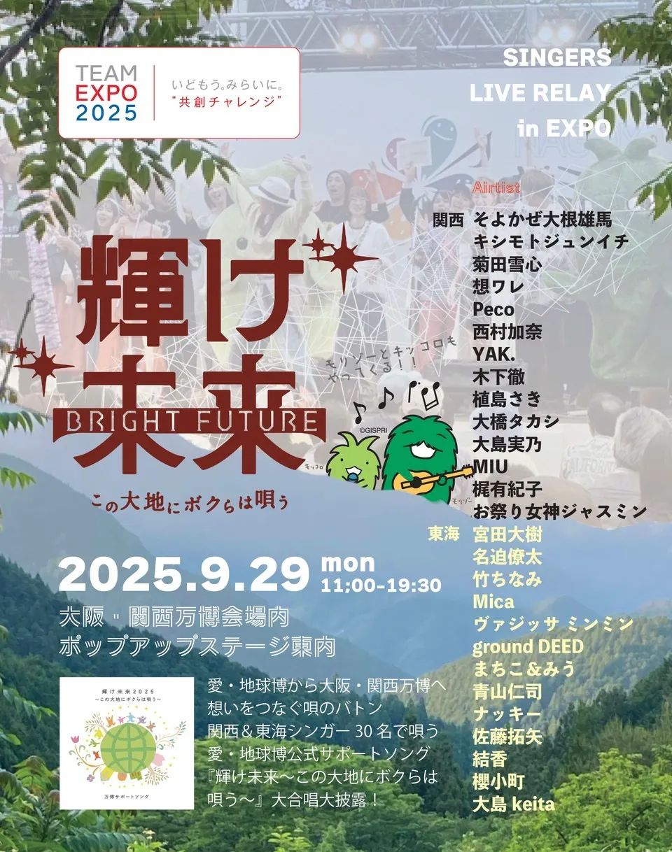 9/29大阪・関西万博内“輝け未来”イベントにモリゾーとキッコロが長久手の山から下り我々の応援に来てくれることが正式決定!モリゾーさん「みんなでしあわせになるんじゃ〜」とのこと♪