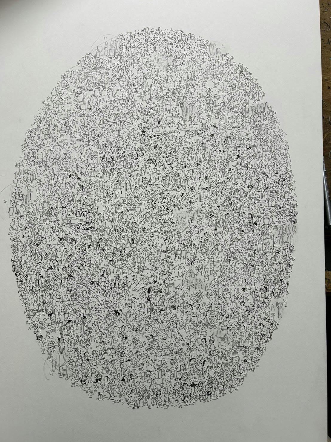 ぎゅっと丸い卵のかたちの中に、無数の人・人・人。