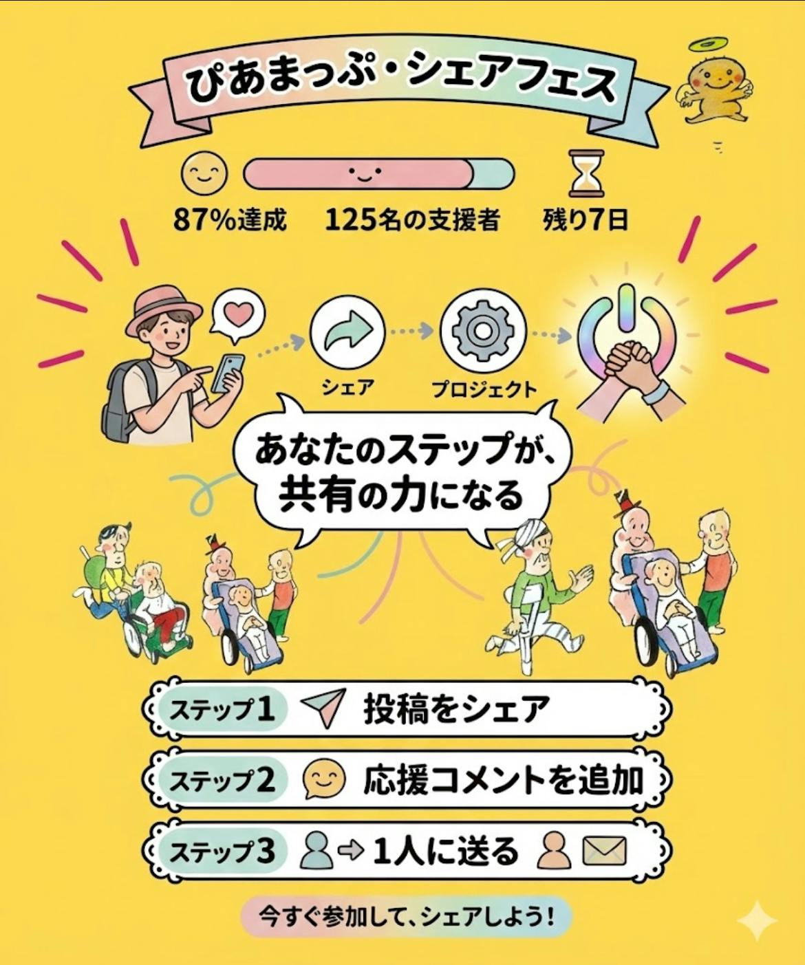 2025/12/07 17:05こんばんは。NPO法人ぼこでこ代表理事の小林純也です。いつも「ぴあまっぷ」プロジェクトを見守ってくださり、本当にありがとうございます。記事執筆時点で、ぴあまっぷのクラファンは2,620,517円(87%)/支援者125名、終了まで残り7日。目標の300万円まで、あと約38万円となりました。ここから先は、我々だけでは届かない人たちに、「あなたの一歩」=シェアの力をお借りしたいと思っています。そこでラスト企画第一弾として、『ぴあまっぷ・シェアフェス』 を開催します!\ 1分でOK!シェアフェスへの参加方法 /▼ステップ1:投稿を見かけたら、まずシェア!これからラストスパートに向けて、オススメリターン、わたしのぴあストーリーなどを、脳フェス関連の各SNSで発信していきます。投稿を見かけたら、リポスト・シェアしていただけませんか?X(旧Twitter):https://x.com/NoKousoke Facebook:https://www.facebook.com/junya.kobayashi.927/ Instagram:https://www.instagram.com/noufesch/ 「いいね」だけでなく、シェアしていただけると、まだこのプロジェクトを知らない方の目に届きやすくなります。▼ステップ2:一言でいいので「あなたの言葉」を添えてもし余力があれば、シェアの際に、「社会的孤立ゼロを目指しましょう!」「支援しました!」「あと1週間で終了です!」など、一言で構わないので、あなたなりのひとことを添えていただけると、とても心強いです。ハッシュタグは、よければ#ぴあまっぷ #社会的孤立ゼロをつけていただけると嬉しいです。▼ステップ3(可能な範囲で):1人だけ、届けたい人に送ってみる「あの人にはきっと刺さりそうだな」と思う友人や同僚、ご家族に、このページのリンクを共有いただけませんか?目標と期間目標:300万円、残り38万円なので、、 「300シェア + 38件の一言応援」を目指します!開催期間:この記事公開から72時間ぴあまっぷは、「支援情報」だけでなく、「好き」や「ちょっと聞いて!」からつながる、体温のあるWebサービスを目指しています。ラスト1週間、どうかお力を貸してください。ご支援・シェア、そして周りの方へのご紹介を、心からお願いいたします。▶︎クラウドファンディングのページはこちらNPO法人ぼこでこ一般社団法人脳フェス実行委員会代表理事 小林純也 もっと見る