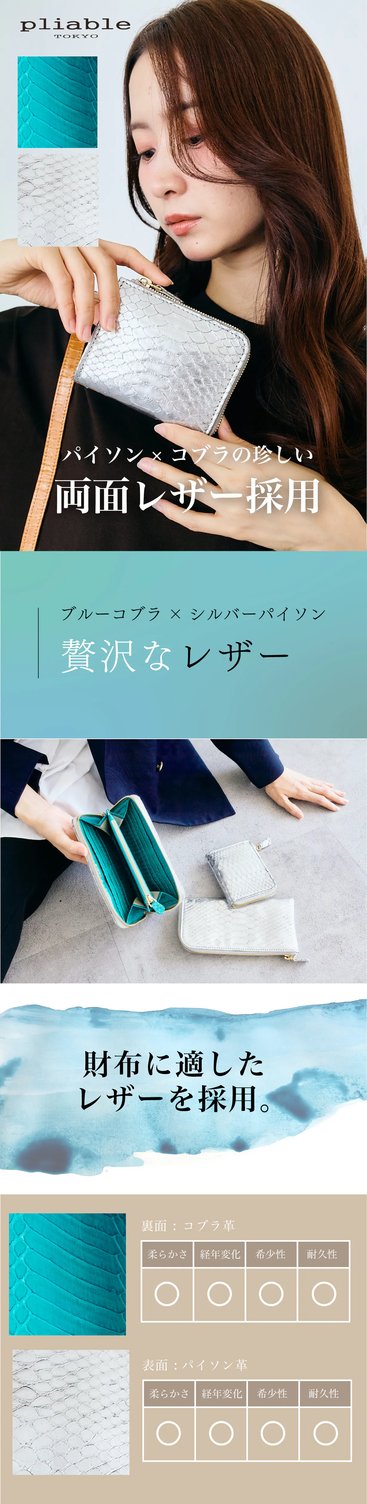 はじめまして、pliable_tokyoです。私たちは、素材の選定から仕立てまで、すべてにこだわったレザーアイテムをお届けしています。 今回のプロジェクトでは、希少なシルバーパイソンとブルーコブラを贅沢に使用したレザー財布を、数量限定でご紹介します。