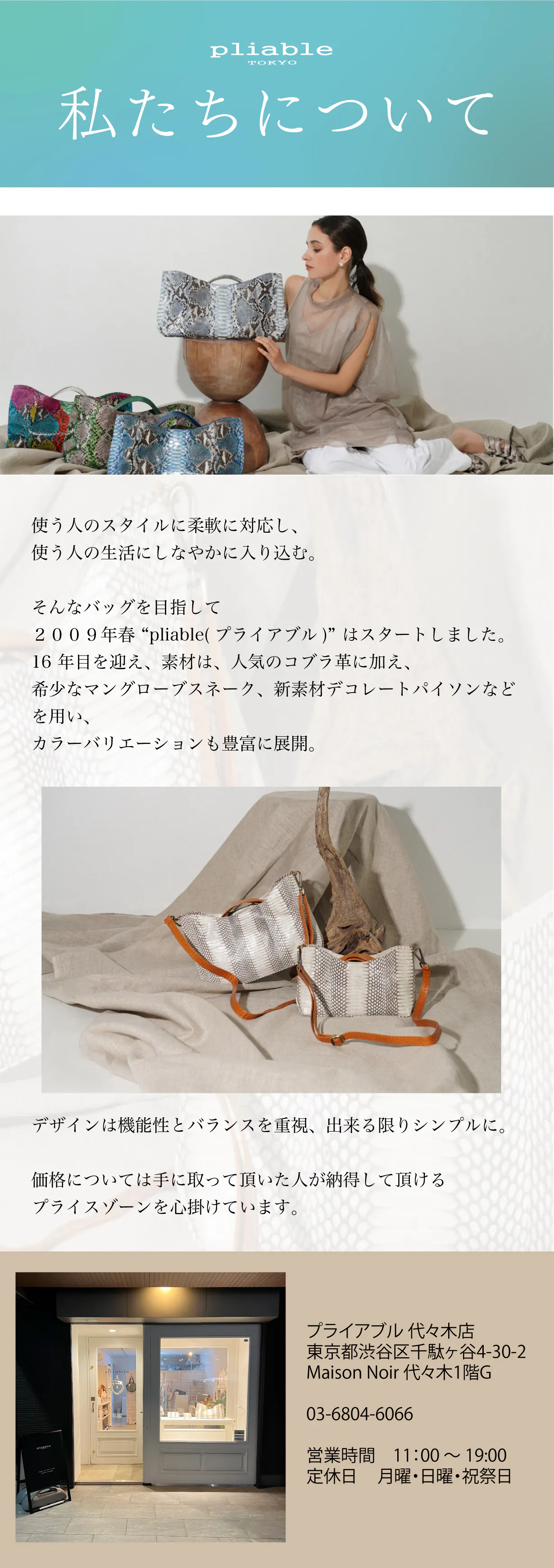 私たちは2009年より、爬虫類レザーを中心としたオリジナルバッグブランド「pliable / プライアブル」を展開しています。