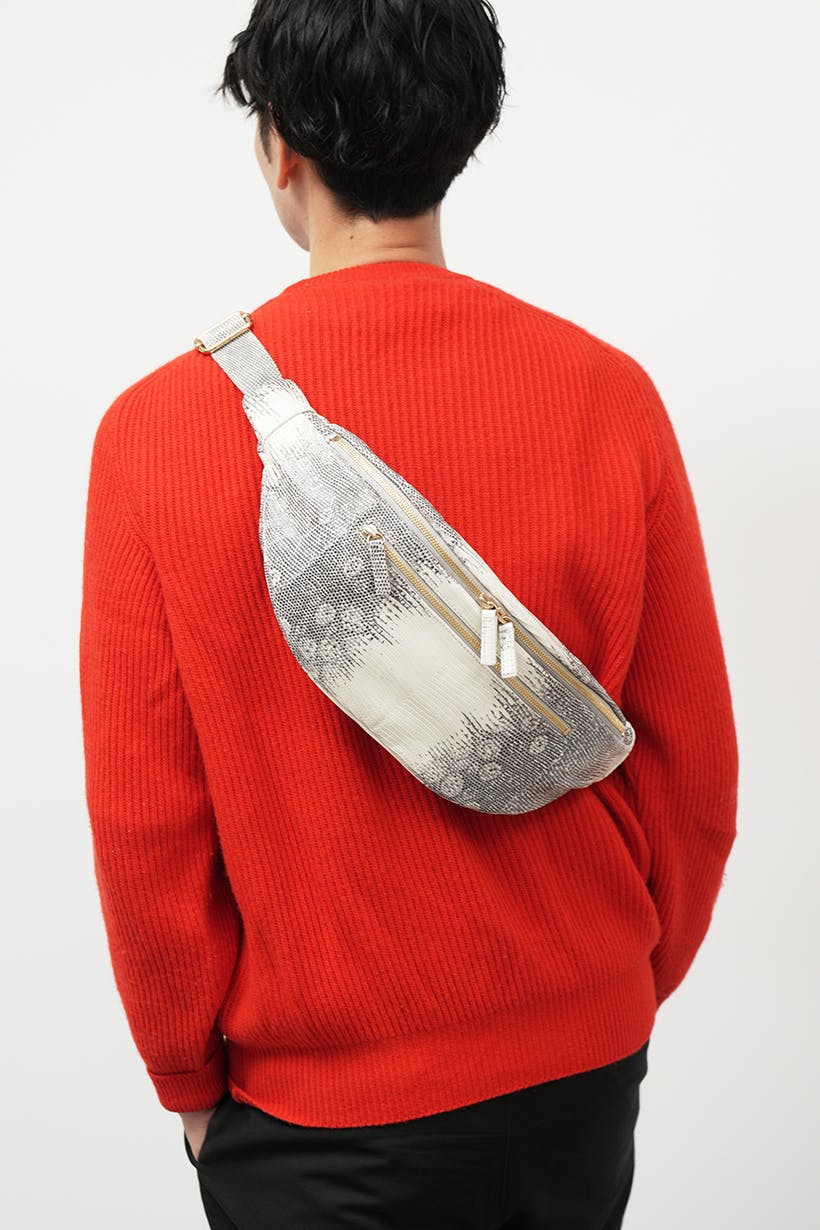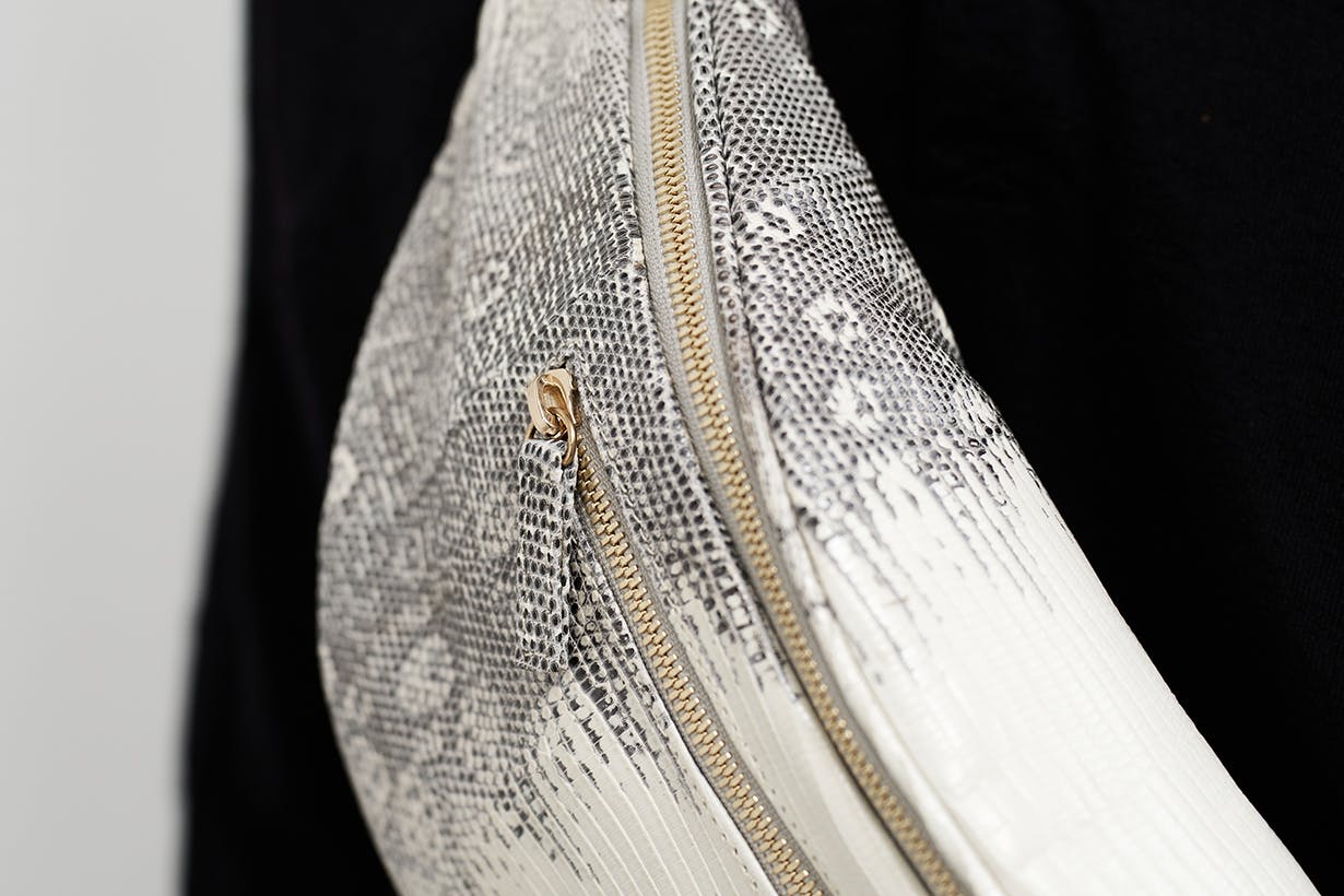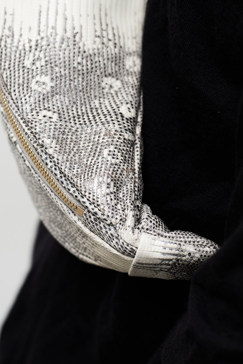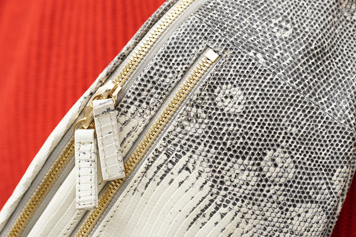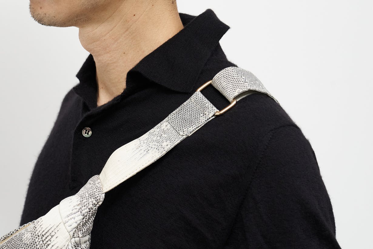 使用しているリングトカゲ革は、東南アジア産のミズオオトカゲ由来。 背部に現れる輪状の斑紋と粒状の鱗が、際立った立体感を生む。