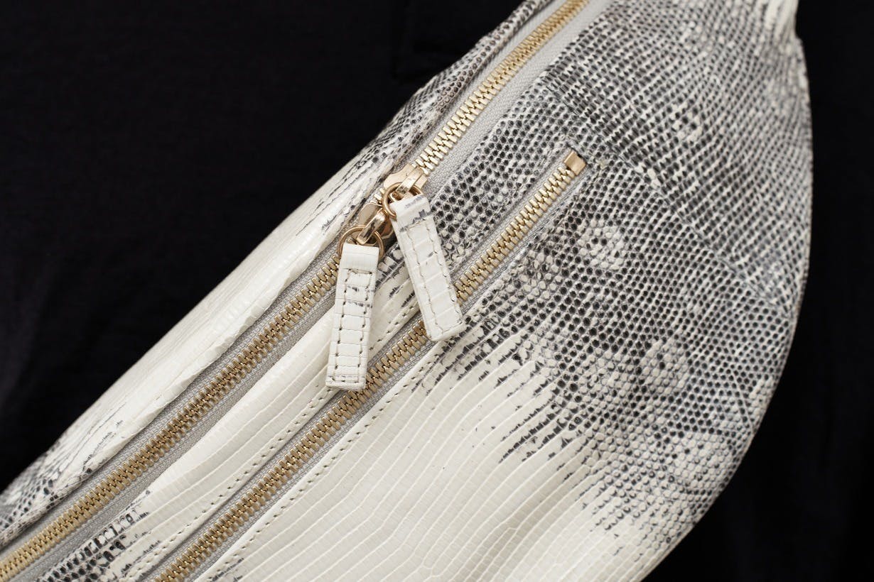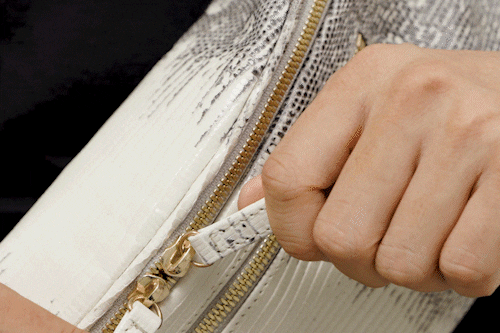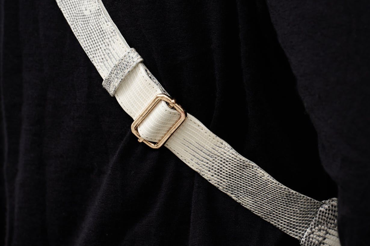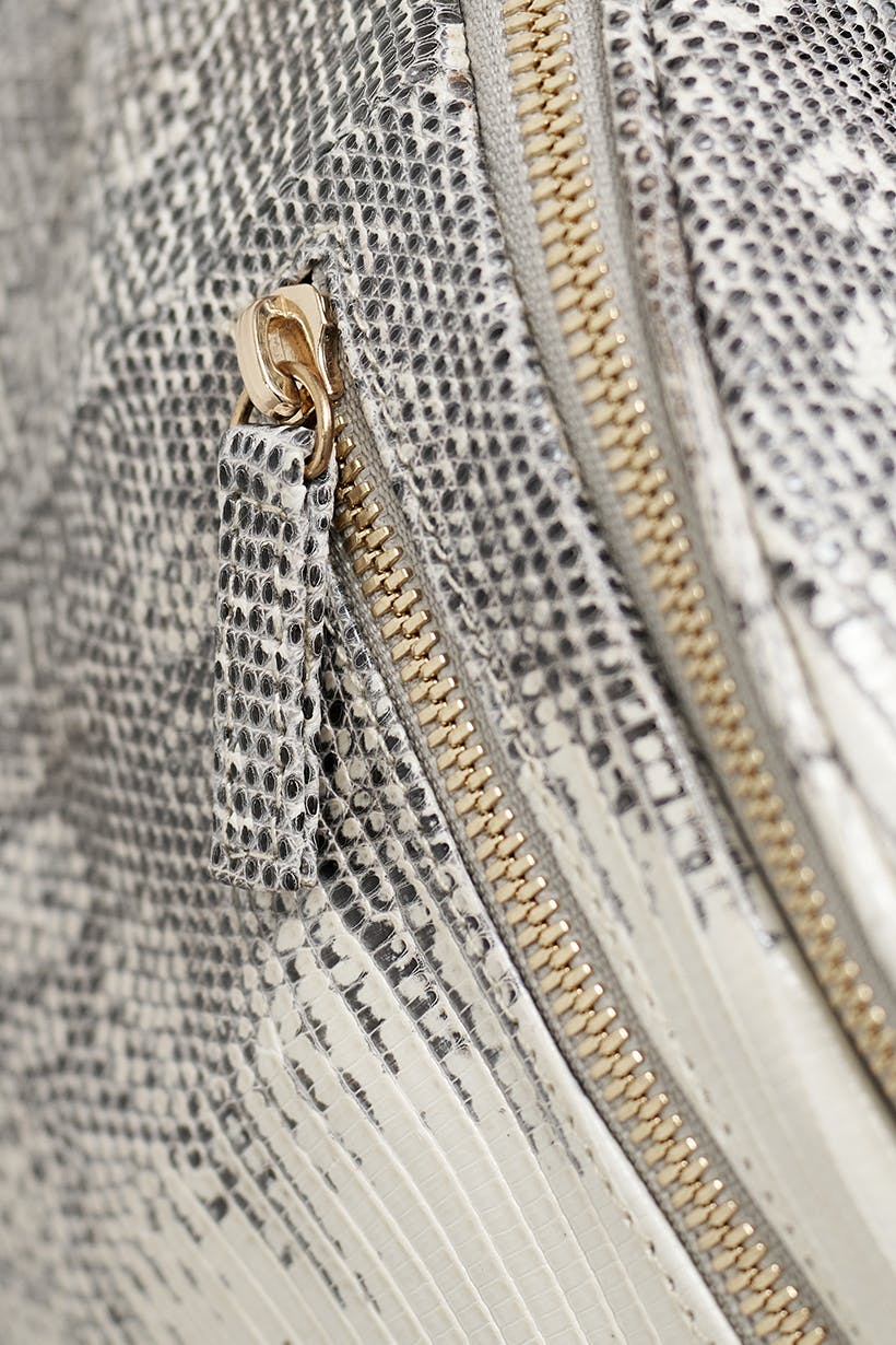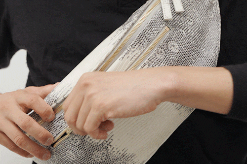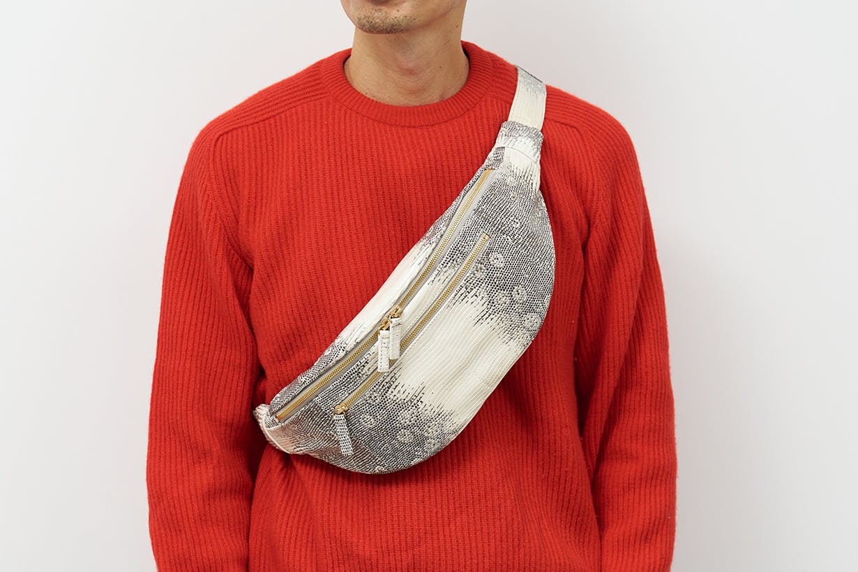 使用しているリングトカゲ革は、東南アジア産のミズオオトカゲ由来。 背部に現れる輪状の斑紋と粒状の鱗が、際立った立体感を生む。