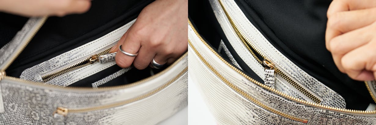 開閉部には、YKK社が展開するハイグレードファスナー「EXCELLA®」を採用。 エレメント(ムシ)を一本ずつ研磨した構造により、滑らかな操作感と美しい輝きを両立しています。