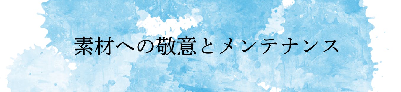 基本は乾いた柔らかい布での乾拭きです。水濡れや直射日光を避け、通気性のある場所で保管してください。防水スプレーやクリーム類の使用は推奨しておりません。