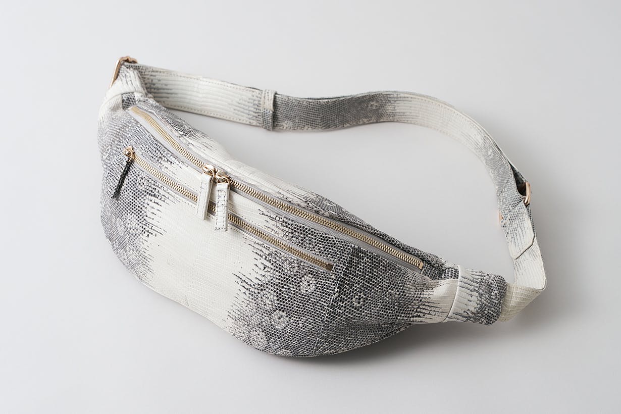 使用しているリングトカゲ革は、東南アジア産のミズオオトカゲ由来。 背部に現れる輪状の斑紋と粒状の鱗が、際立った立体感を生む。