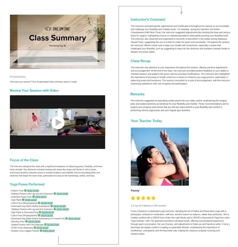 インストラクターとの45min のクラスが終了したら、クラスの状況を独自のAIが解析したレッスンのサマリーレポートがメールで送信されます。(参考:【ヨガ✕生成AI】米国向けオンラインヨガ 生成AIでフィードバックレポートを自動生成(新機能リリース))