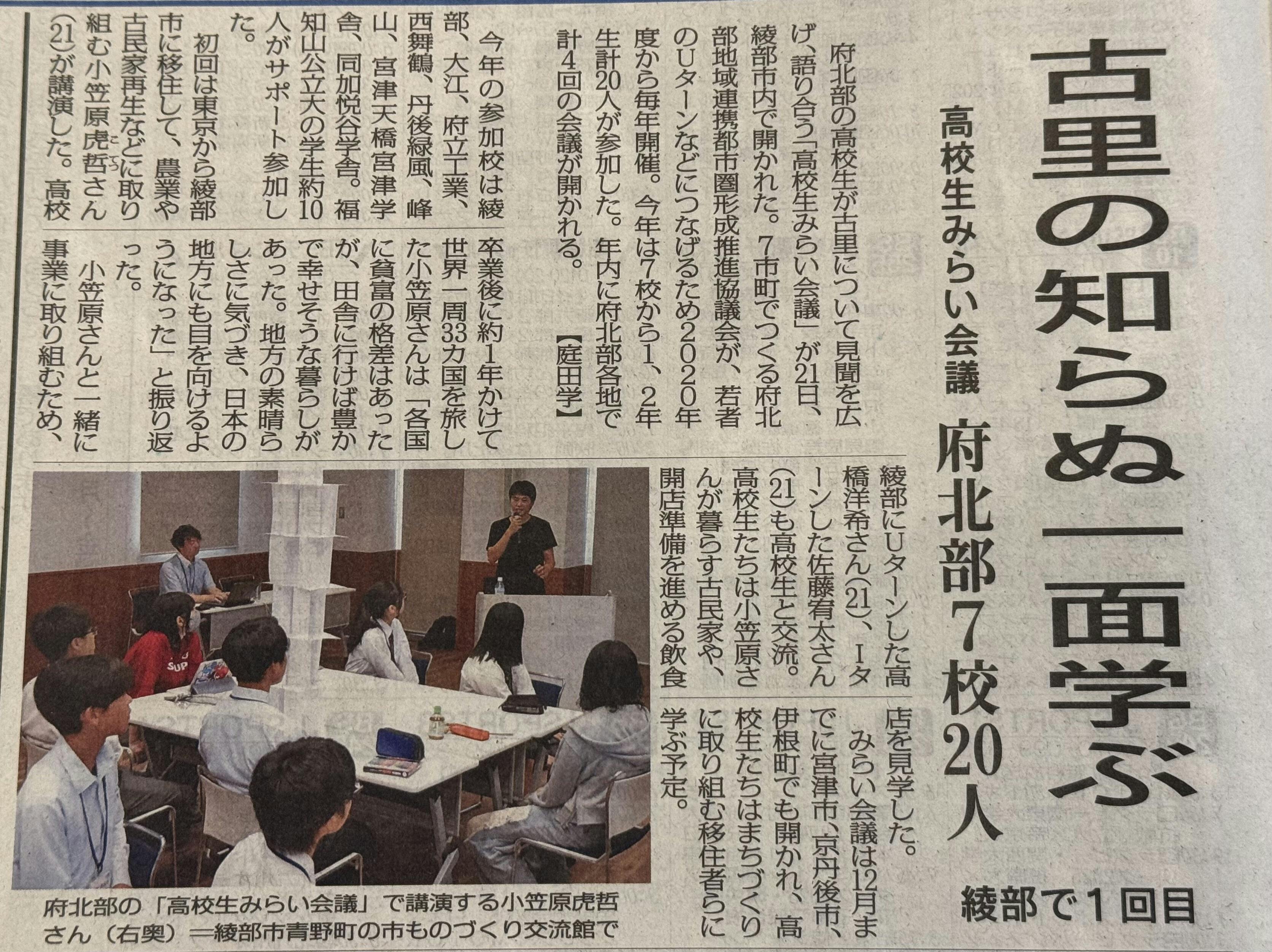 2025/09/25 19:19先日の「高校生みらい会議」での登壇と見学ツアーの様子を、毎日新聞/京都新聞に掲載いただきました。(紙面写真を添付しています)当日は、田舎のポテンシャルとこれからをテーマにお話ししました。初めての講演で最初は少し緊張しましたが、話すうちに場が温まり、後半はいつものペースに。資料に頼りすぎず、ほぼアドリブで臨んだ分、構成や伝え方がまだまだで課題も見つけられて良かったです。登壇後は、カフェ「虎」(綾部・広小路1-2)予定地での寿司づくり体験、そして僕が暮らす古民家のルームツアーへ。高校生から届いた感想(抜粋)「実際に動いている人の話を間近で聞けて、貴重な経験でした」「ツアーで“やろうとしていること”が立体的に分かったのが良かった」「自分で限界を決めていたかも。可能性を上げていける気がした」「夢を形にするってこういうことなんだと思った。しかも楽しそう」「学歴や年齢に縛られすぎない方がいい、って腹落ちしました」「同じ志の仲間で動くと発見が増える。自分も挑戦したい」など、たくさんの声をいただき、開催して本当によかったと感じています。関係者のみなさん、高校生・大学生のみんな、先生方、ありがとうございました。この良い余韻を次の一歩に変えて挑戦を進めます。進捗はまた活動報告で共有します。支援での後押し、またはシェアでの拡散、どちらも大きな力になります。リンク:https://camp-fire.jp/projects/view/879118締切:10/19(日)引き続き、応援よろしくお願いします。 もっと見る
