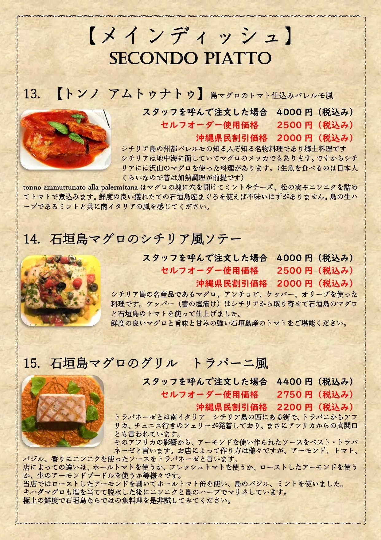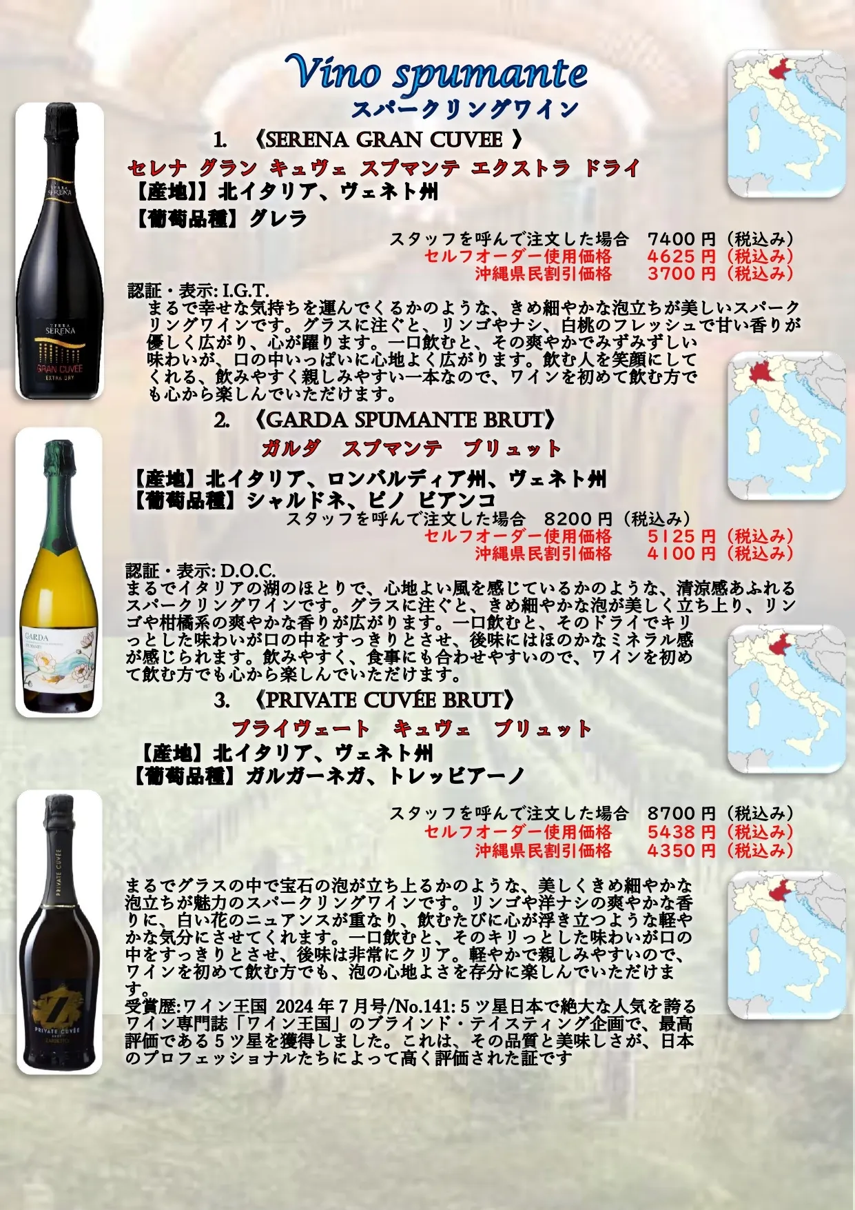 2025/09/29 16:14ワインメニューにつきましても県民割引を致します。実態として最低賃金が日本で一番低い地域である沖縄(所得平均も本州の1/2)である事と、ふだんから大変お世話になっている方々と言う事で会計の時に20%Offを適用させて頂きます。またディナーの県民割引はグループの方の場合、半分以上の方が沖縄県に居住している証明が会計時に出来るのであるのならグループ全体を20%Offに致します。ただしいかなる理由があったとしても半分以上の方が沖縄県民である事を証明できない場合は割引は致しませんのでご承知おきください。さてワインの話に戻りますスパークリングワインについては北部が盛んに作っているために生産地は限定されてしましまいますが、他の赤ワイン、白ワインについては可能な限りイタリア全州そして可能な限りのブドウの種類を取り揃えたいと思っています。ワインはフルーツである葡萄から作られますから、地域によって違う気温や土壌、日照時間によって様々な違いが同じ葡萄の種類でも変わってきます。またパッシート(陰干し)やマセラシオン(破砕したブドウ全体を漬け込む)等の技術によってさらに違った表情を見せます。こうした楽しみを皆様に体験して頂きたいとおもいます。 もっと見る