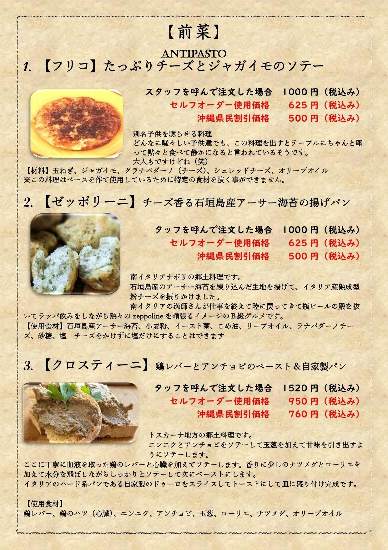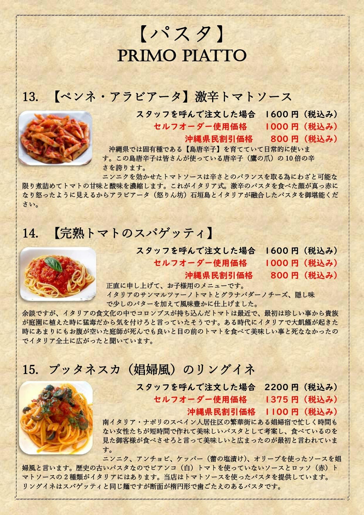 ワインメニューにつきましても県民割引を致します。実態として最低賃金が日本で一番低い地域である沖縄(所得平均も本州の1/2)である事と、ふだんから大変お世話になっている方々と言う事で会計の時に20%Offを適用させて頂きます。またディナーの県民割引はグループの方の場合、半分以上の方が沖縄県に居住している証明が会計時に出来るのであるのならグループ全体を20%Offに致します。ただしいかなる理由があったとしても半分以上の方が沖縄県民である事を証明できない場合は割引は致しませんのでご承知おきください。さてワインの話に戻りますスパークリングワインについては北部が盛んに作っているために生産地は限定されてしましまいますが、他の赤ワイン、白ワインについては可能な限りイタリア全州そして可能な限りのブドウの種類を取り揃えたいと思っています。ワインはフルーツである葡萄から作られますから、地域によって違う気温や土壌、日照時間によって様々な違いが同じ葡萄の種類でも変わってきます。またパッシート(陰干し)やマセラシオン(破砕したブドウ全体を漬け込む)等の技術によってさらに違った表情を見せます。こうした楽しみを皆様に体験して頂きたいとおもいます。