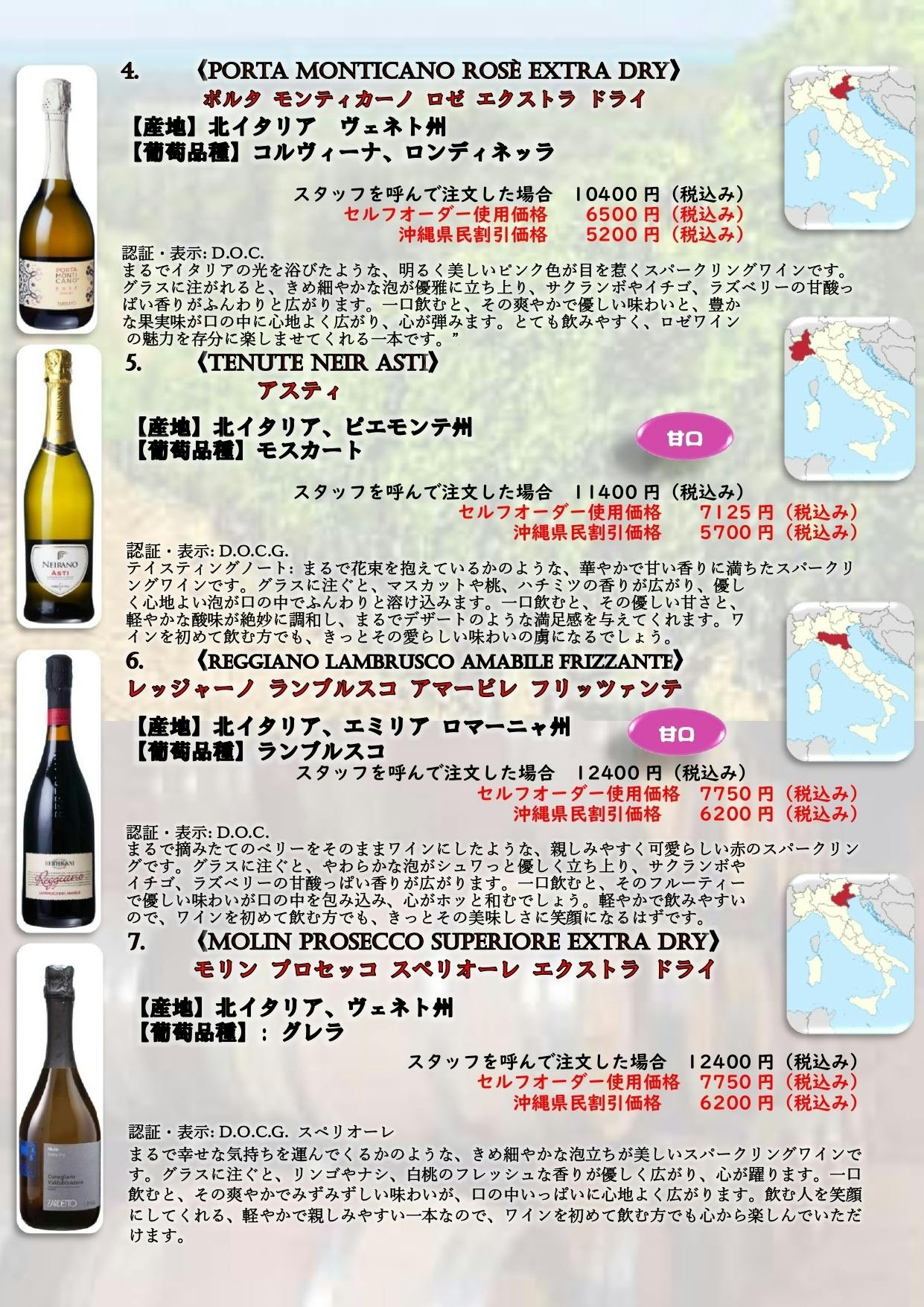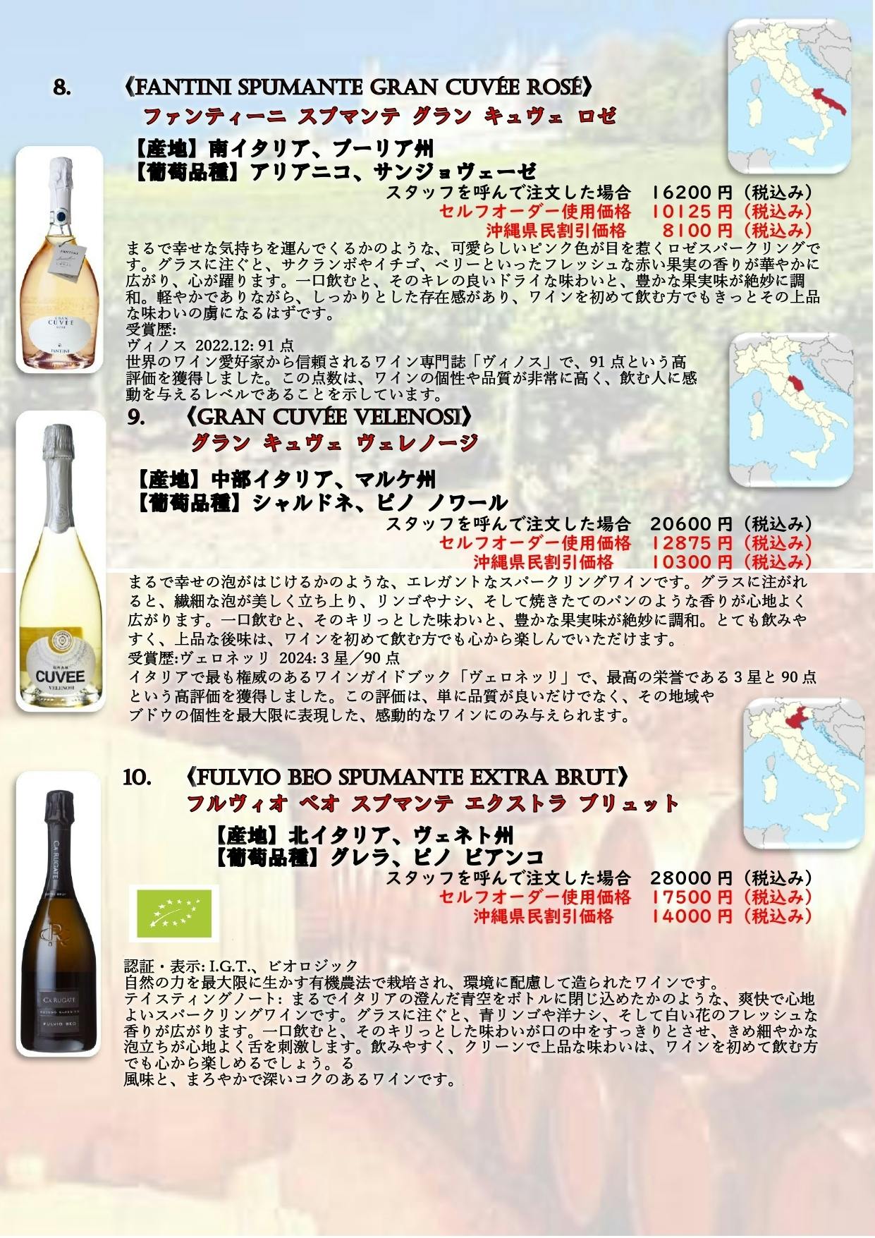 スパークリングワインについては北部が盛んに作っているために生産地は限定されてしましまいますが、他の赤ワイン、白ワインについては可能な限りイタリア全州そして可能な限りのブドウの種類を取り揃えたいと思っています。