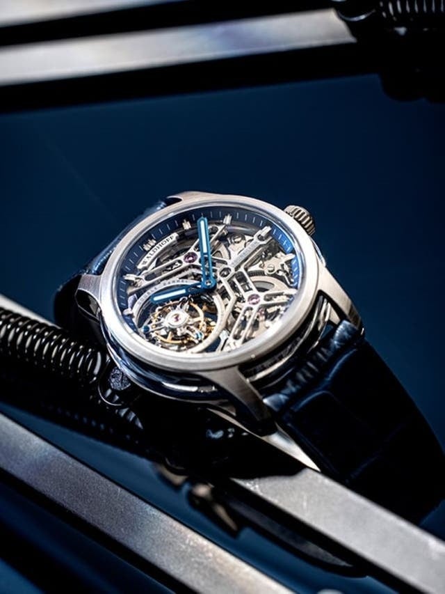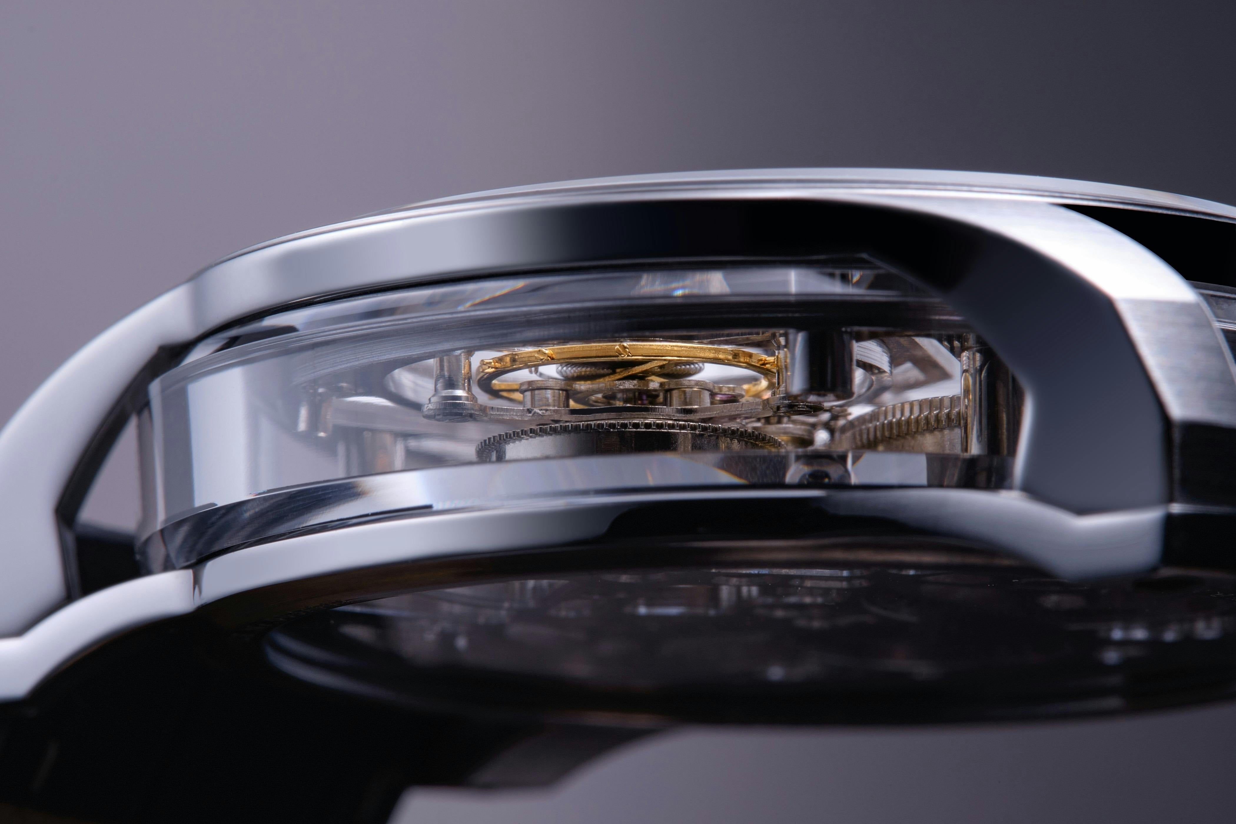 そしてモダンで幾何学的なフェイスのデザインの中にトゥールビヨンの機械仕掛けを前後、側面から鑑賞できる「フルスケルトン」へと進化しています。
