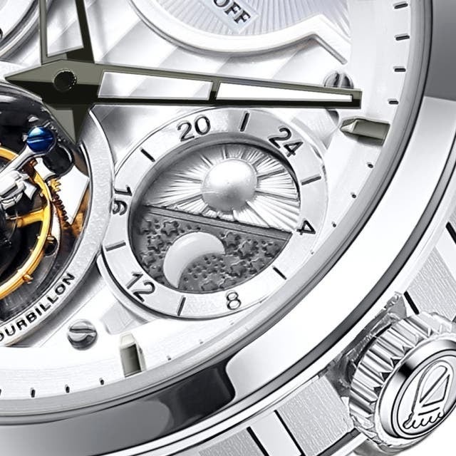 さらに前モデルは3時方向に地球儀を模した24時間計を配しましたが、今回は基本に立ち返り、サンアンドムーンをデザインした24時間計に変更。