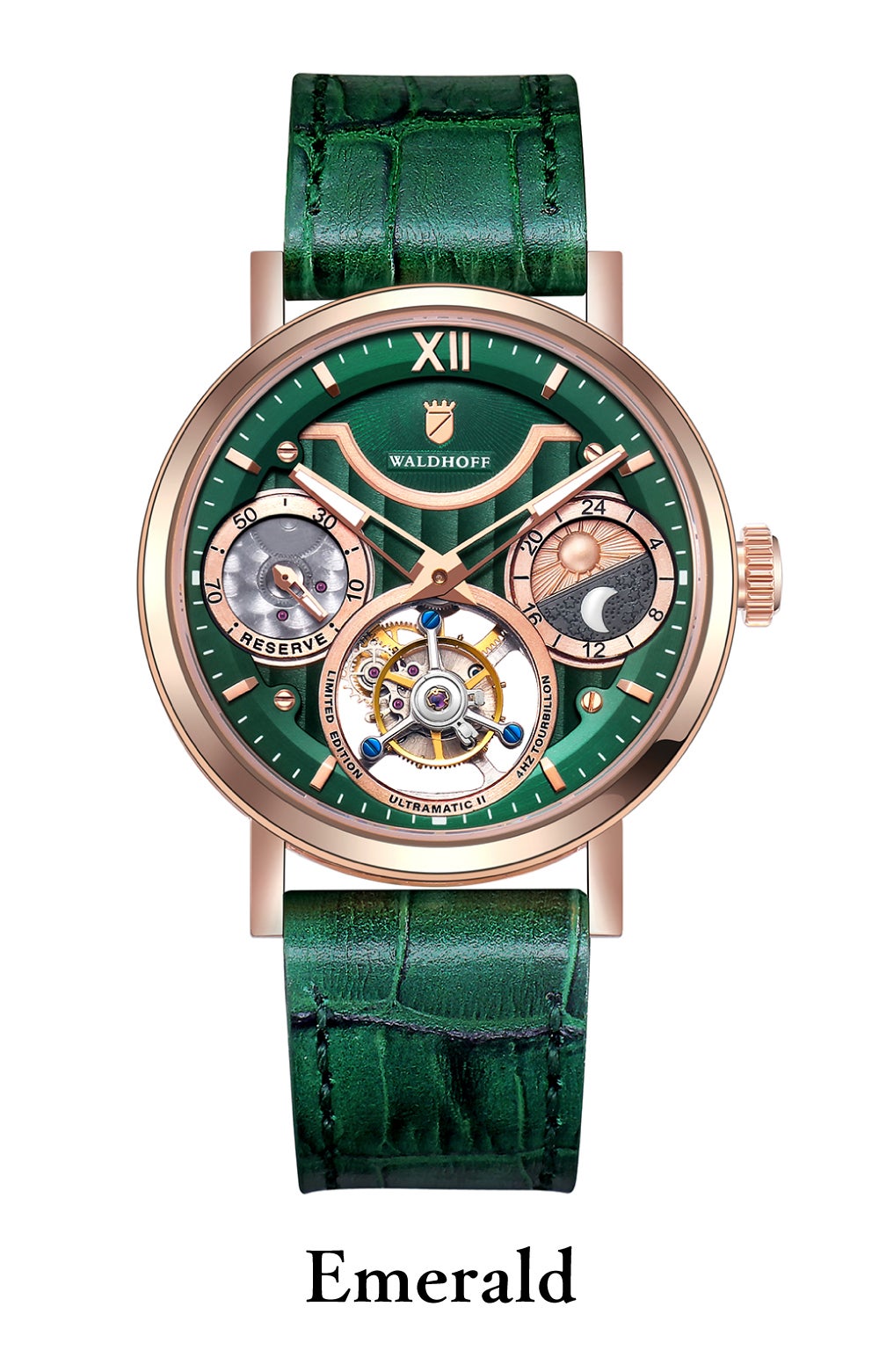 宝石のエメラルドのように鮮やかなグリーンのフェイスとストラップが圧倒的な個性を放つモデルです。