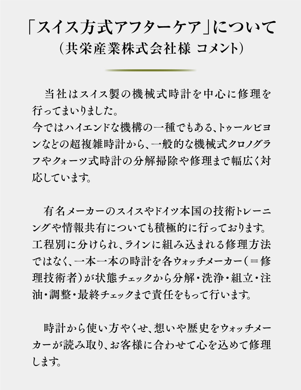その運営実務については、国内有数の時計修理実績をお持ちの共栄産業株式会社様に担って頂いております。