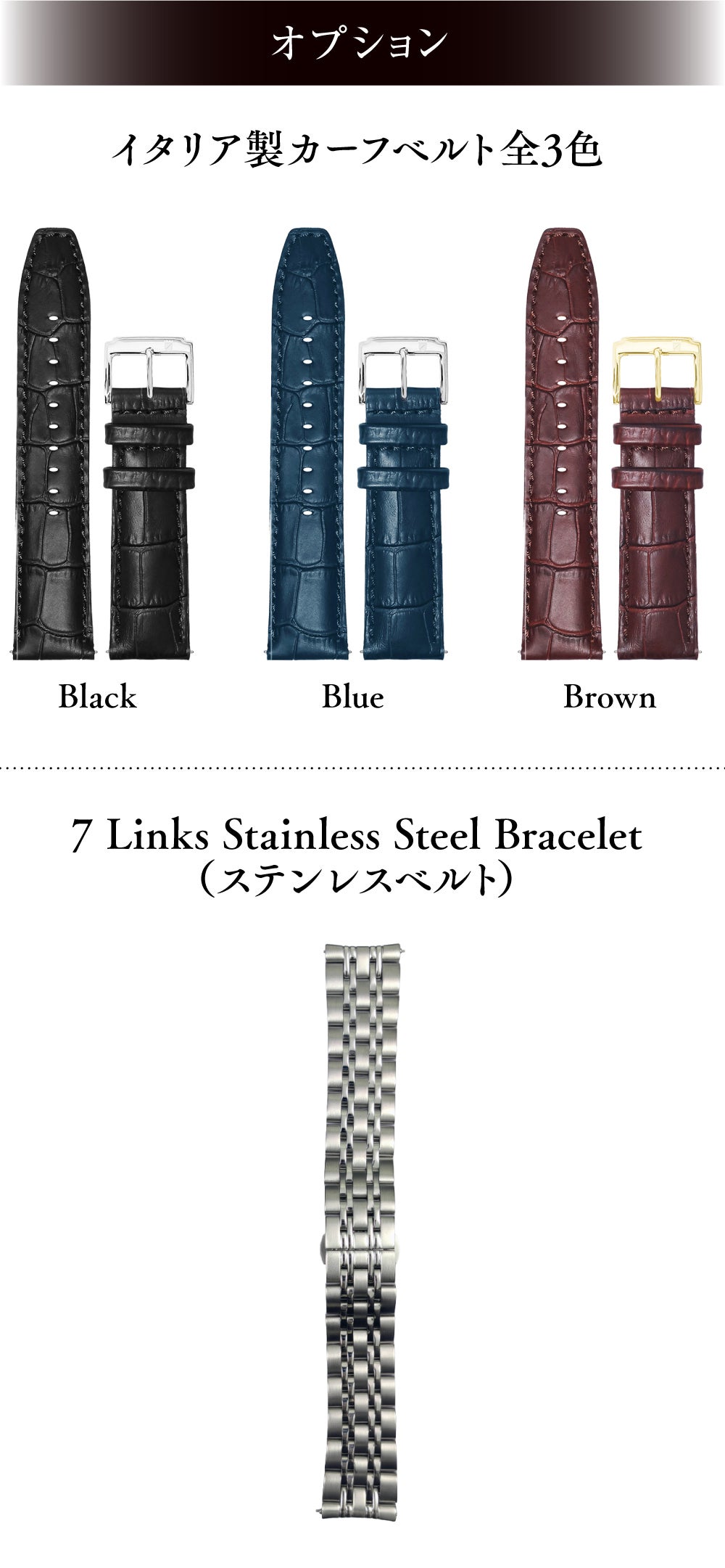 ※機械式時計は磁気の近くで長時間使用すると、使われているパーツが磁気を帯び故障の原因となります。ご使用の際はマグネットブレスなど磁石を用いたアクセサリーとの併用を避け、磁石が無い場所で保管してください。