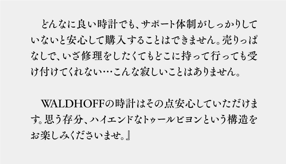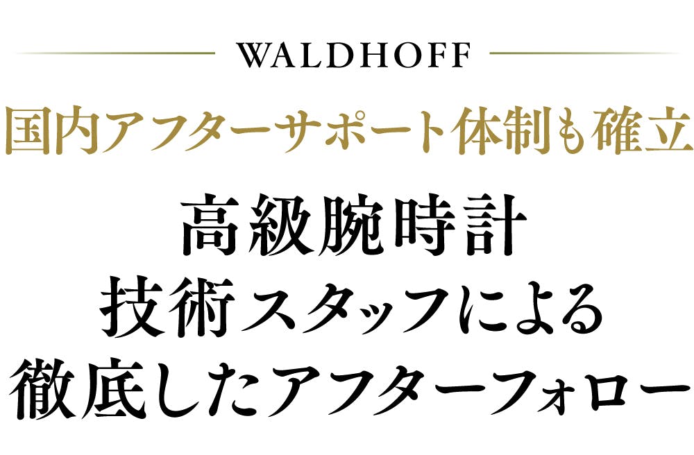 具体的には、WALDHOFF腕時計のメカニカルサポートをWOSTEP取得者、 1級時計修理技能士、有名ブランド公認技術者など、確かな技術と多くの経験と実績を保有する、総勢50名以上の技術スタッフの皆さまに行っていただいています。