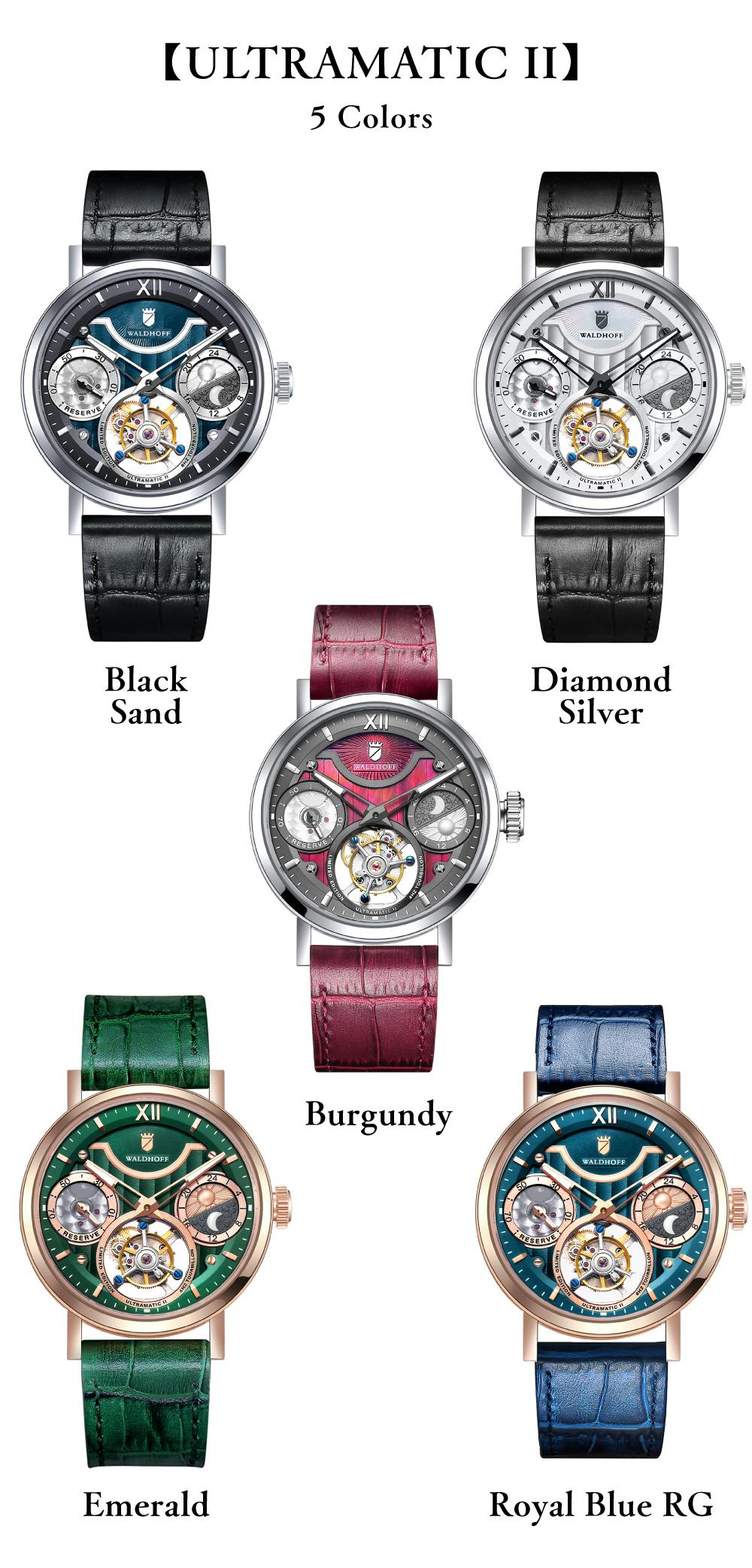 [ULTRAMATIC II ]はBlack Sand(ブラック・サンド)、Emerald(エメラルド)、Diamond Silver(ダイモンドシルバー)、Royal Blue RG(ロイヤル・ブルーRG)、Burgundy(バーガンディ)の5色をご用意しました。