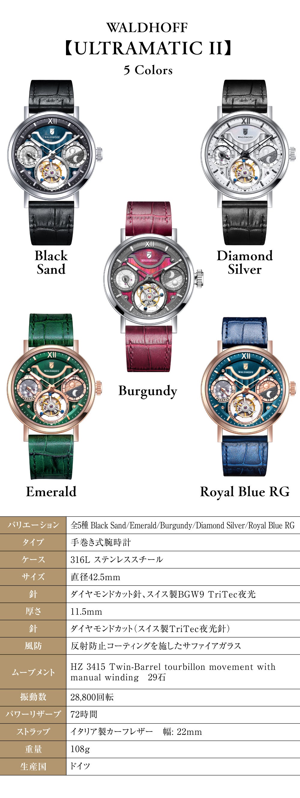 [ULTRAMATIC II ]はBlack Sand(ブラック・サンド)、Emerald(エメラルド)、Diamond Silver(ダイモンドシルバー)、Royal Blue RG(ロイヤル・ブルーRG)、Burgundy(バーガンディ)の5色をご用意しました。
