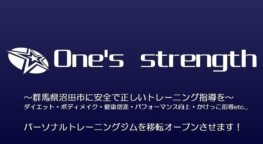 初めまして。パーソナルトレーニングスタジオOne's strength代表の阿部亮太と申します。S55年生まれの38歳です。One'sstrength(ワンズストレングス)の意味は、one's=一生、ずっと strength=強さ です。ご高齢者からアスリートまで様々なレベルでの「強さ」をずっと持ち続けて生活してほしい。という意味を込めています。