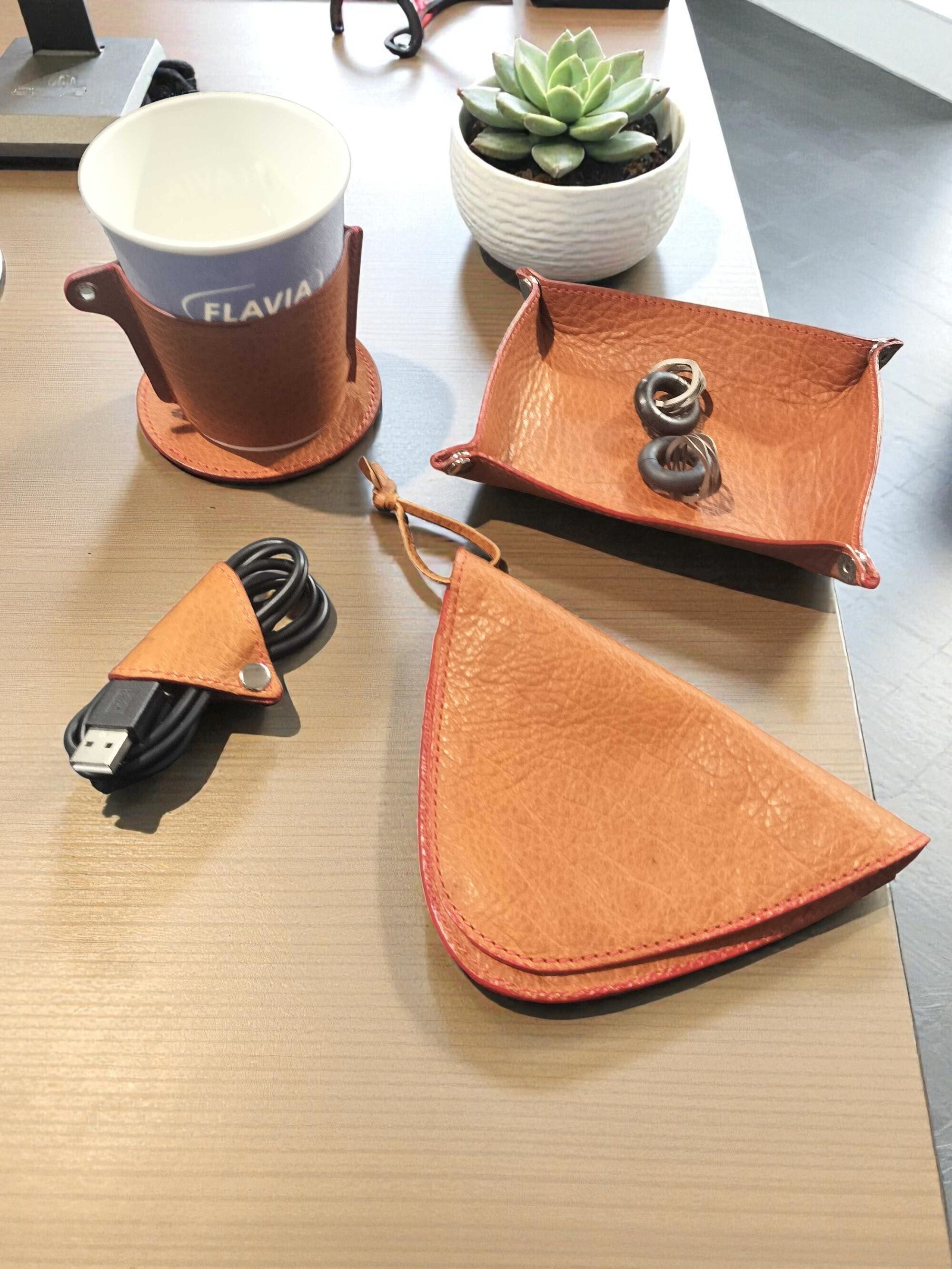 手にするのは、革の温もりを感じるコースターやカップスリーブ、暮らしの相棒となるコードホルダ―や鍋つかみ、そしてテーブルやキャンプサイトを彩るトレイ。どれも「いただいた命を無駄にしない」という想いを込め、ひとつひとつ丁寧に仕上げます。
