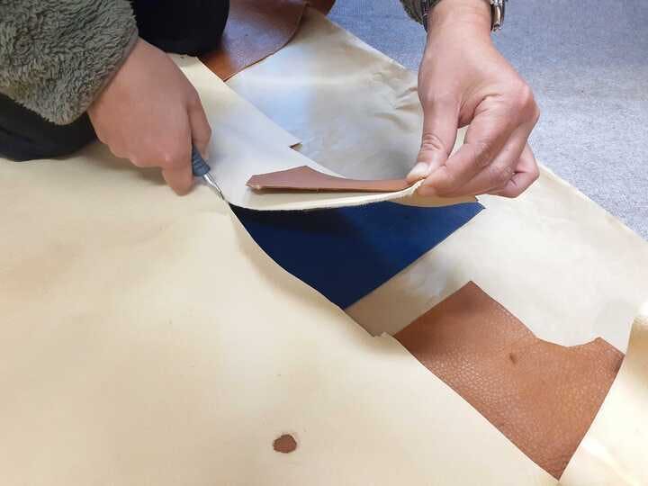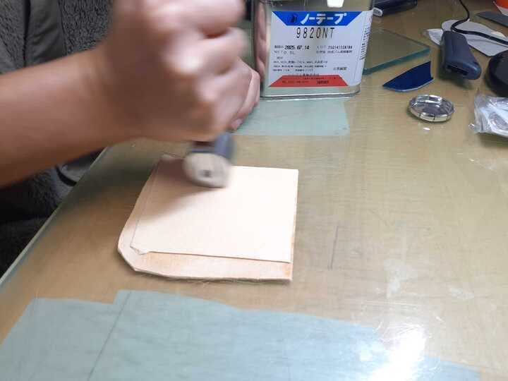 次に、革の裏面同士を貼り合わせる工程。 接着することで「両面が表革」の仕立てになり、仕上がりの質感がぐっと良くなります。