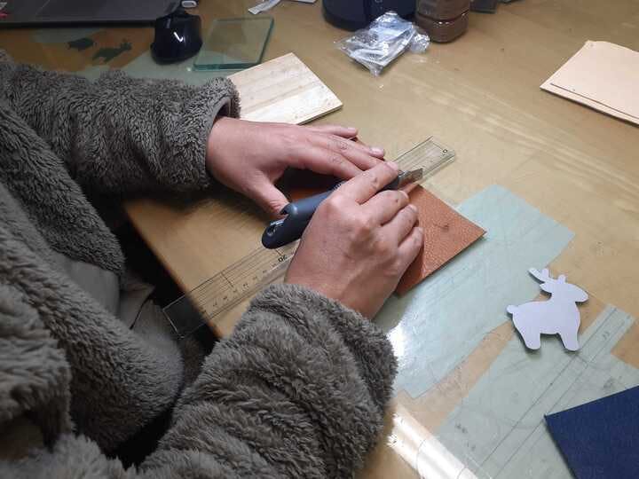 まずはキーホルダーに使う革を、必要なサイズに正確にカットしていきます。 他の返礼品と同時進行のため、無駄の出ないよう慎重に採寸して進めます。