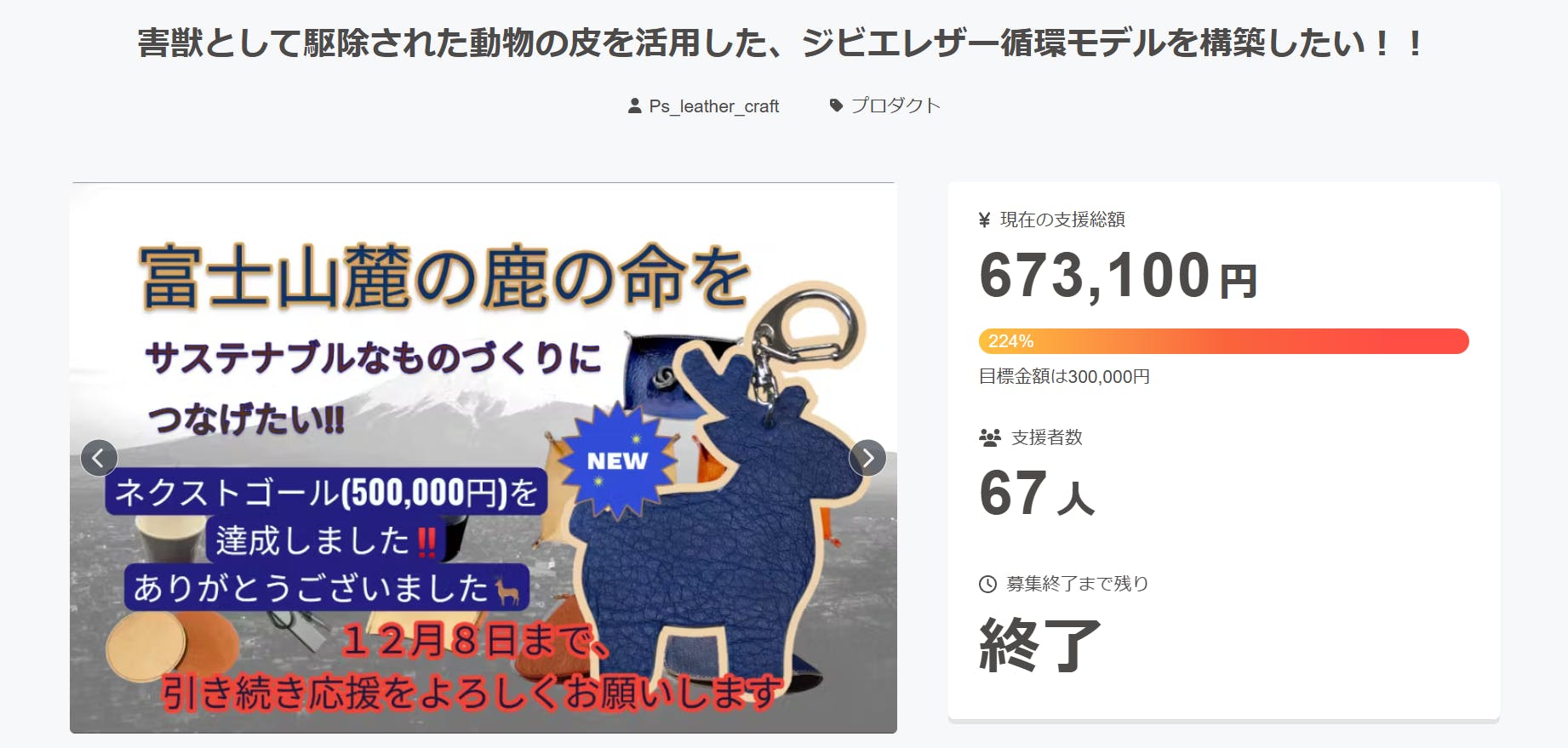 クラファンの終了は、プロジェクトの完了ではありません。 いただいたご支援を大切に活かし、富士山麓のジビエレザー循環モデルを、形にしていきます。今後も革の制作状況や活動の進捗を、CAMPFIREの活動報告で継続してお届けしてまいりますので、 ぜひ見守っていただけたら嬉しいです。