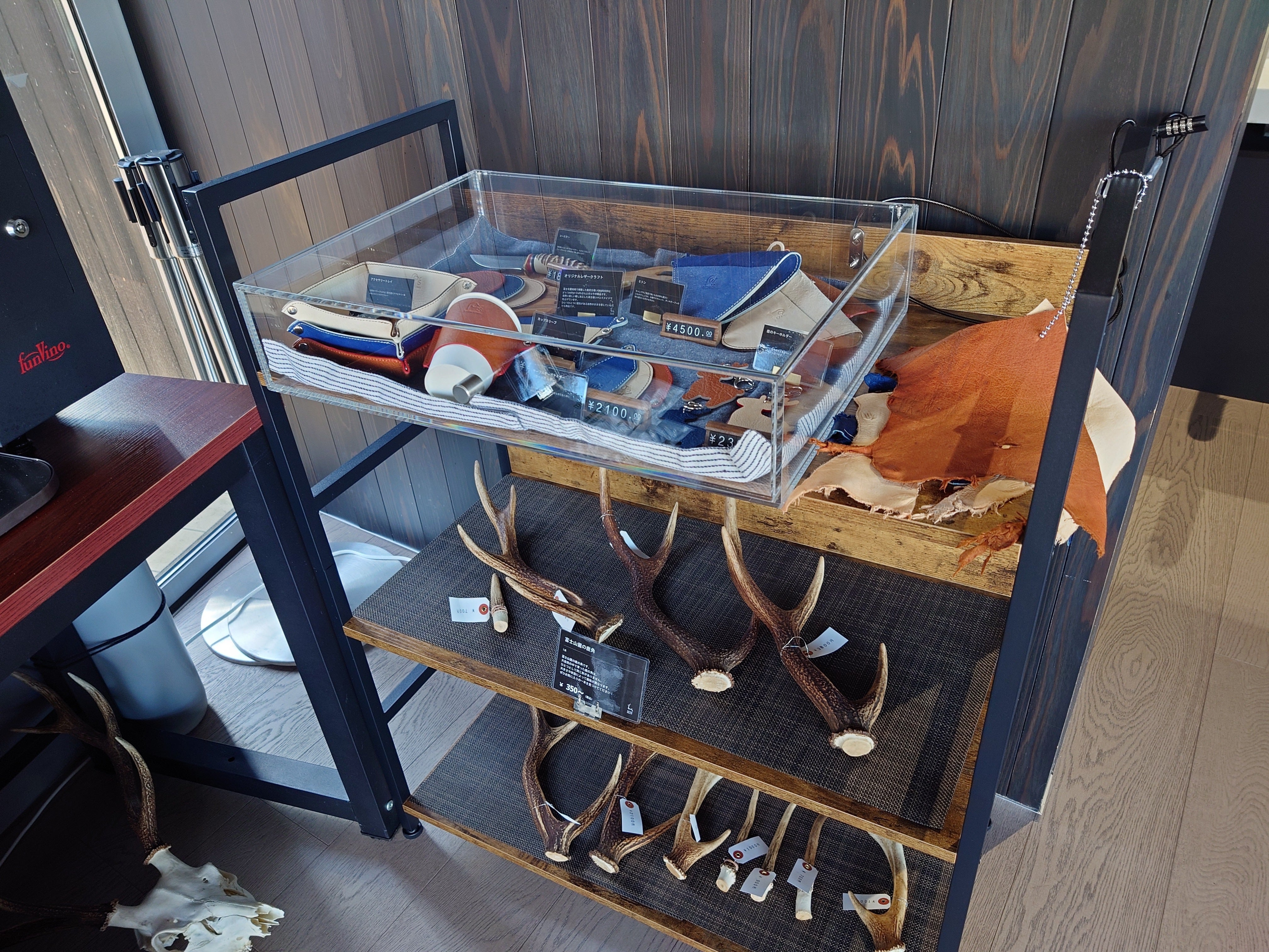 店頭では、実際に鹿革の風合いを感じてもらえるように展示しています。