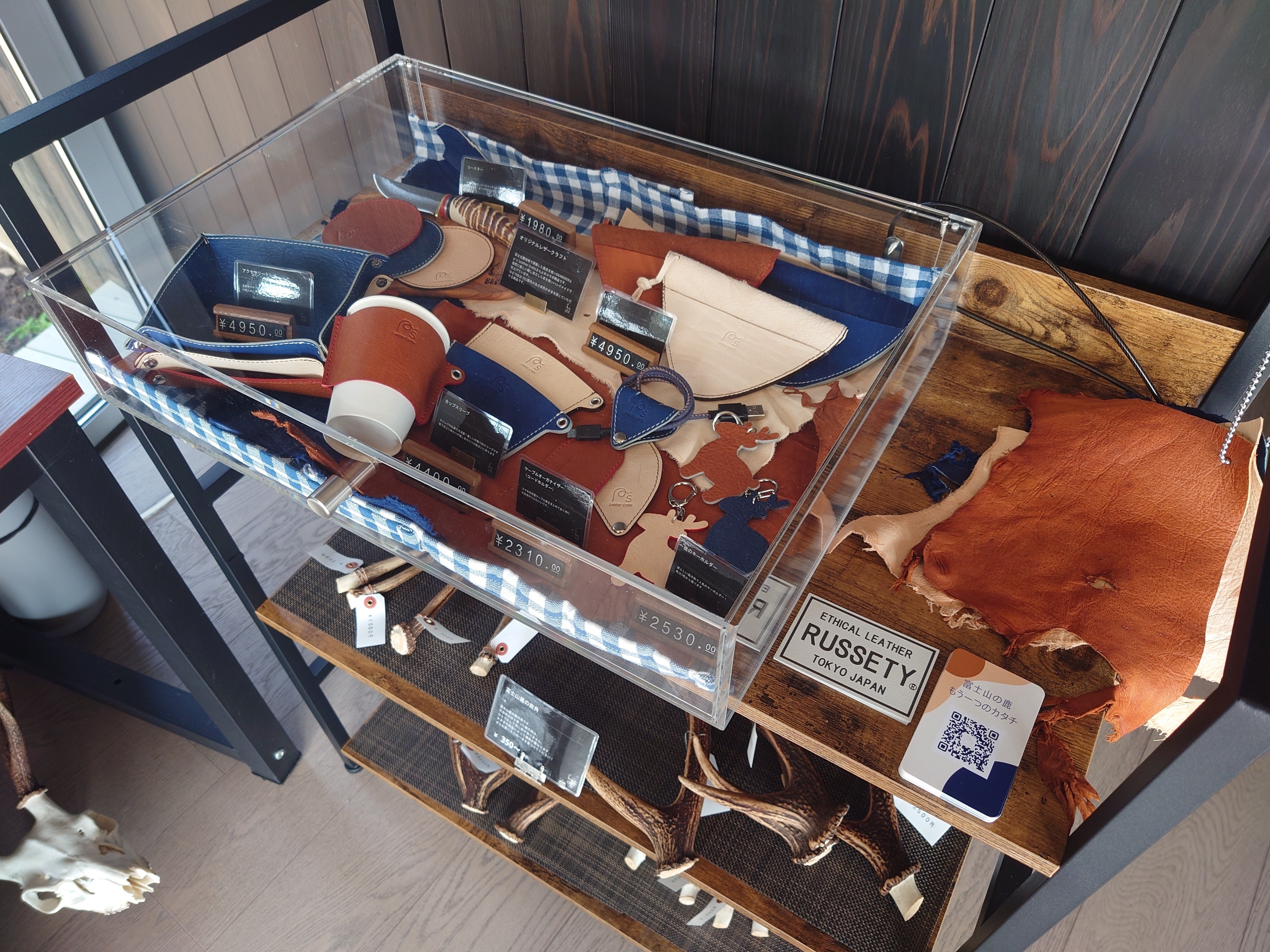 これまでクラウドファンディングを通じて形にしてきたジビエレザーの商品。4月から富士山ジビエセンター「DEAR DEER」店頭にて販売開始となりました。