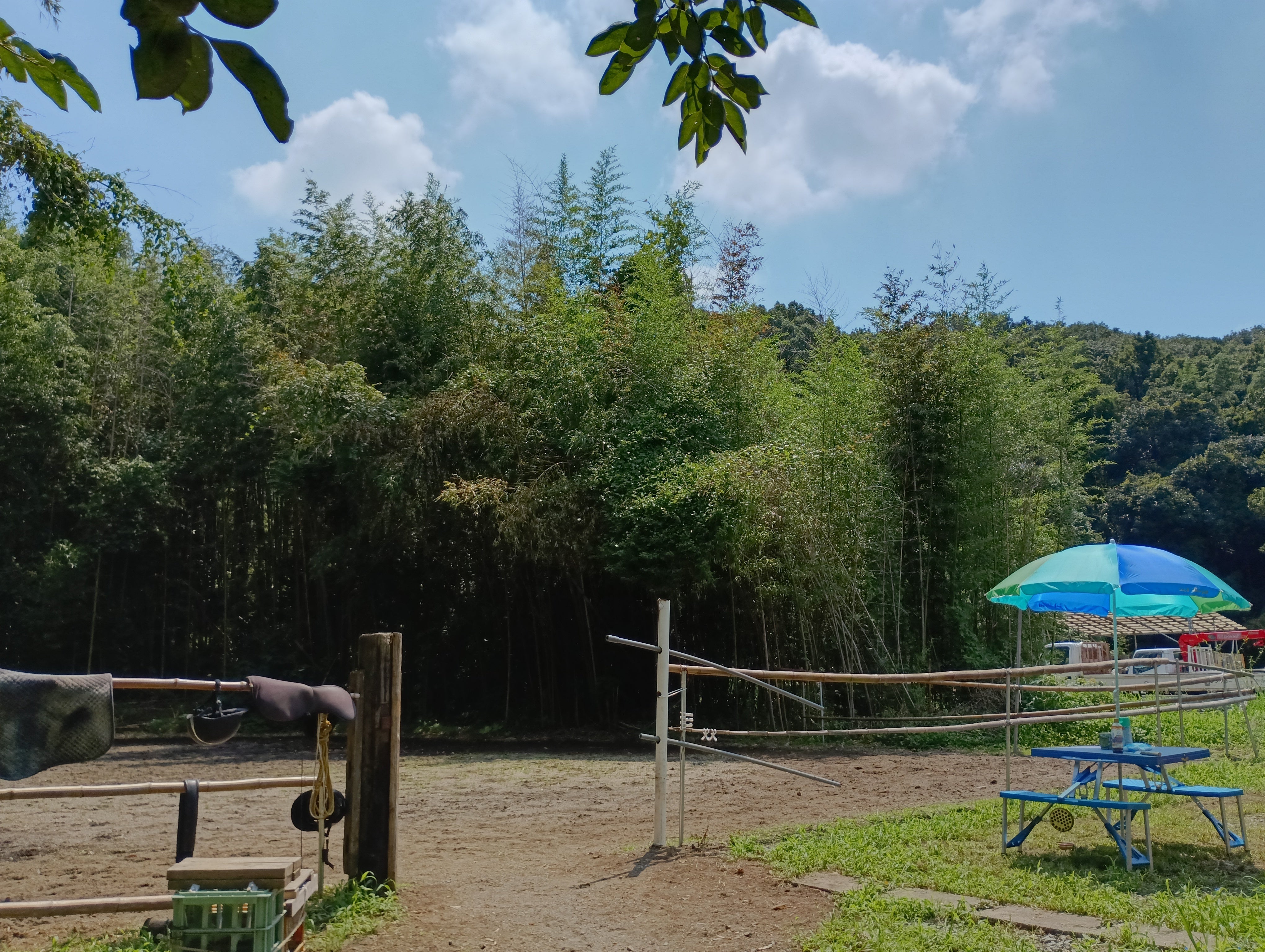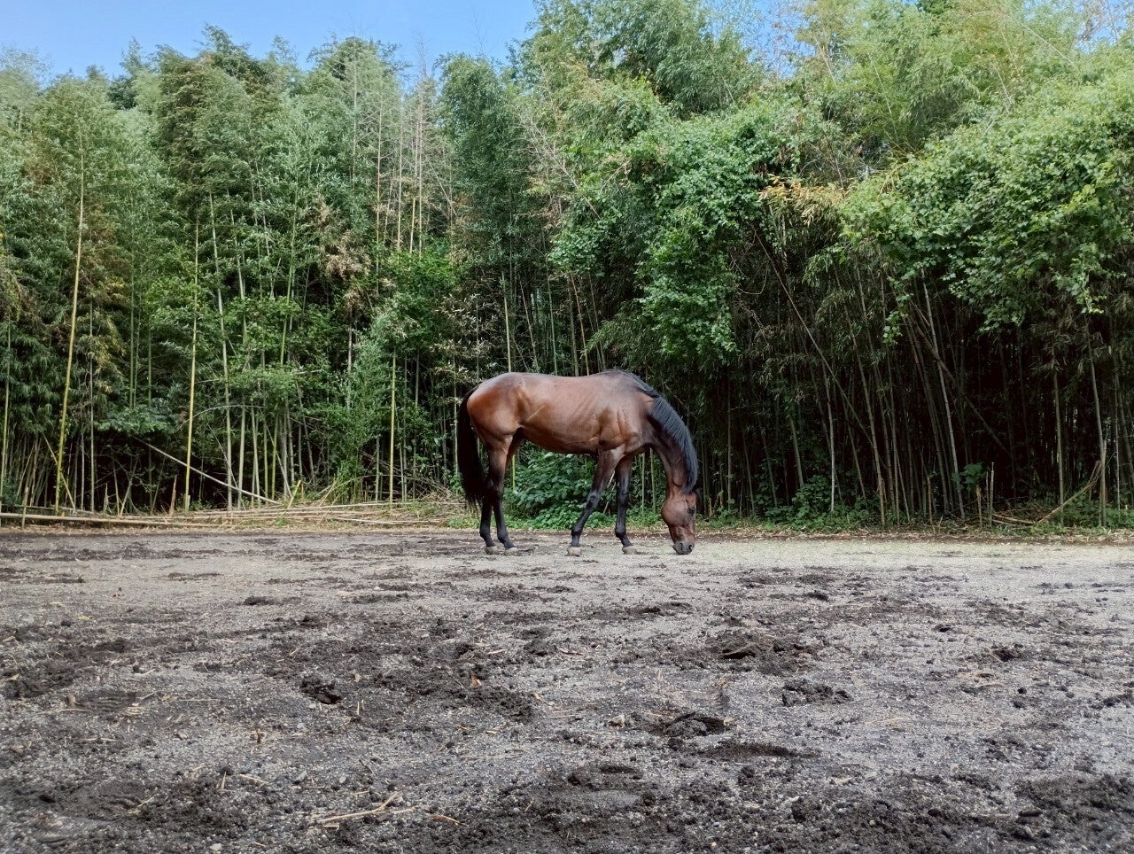 まず最初に雑草をどかす作業が必要でした。馬場の周りが竹林なので竹の根本が相当な数ありました。それを掘り起こして撤去しつつ、最後は人の目で何度も何度も残りがないか確認も。万が一竹の根本が残っていたら馬が致命的な怪我をします。