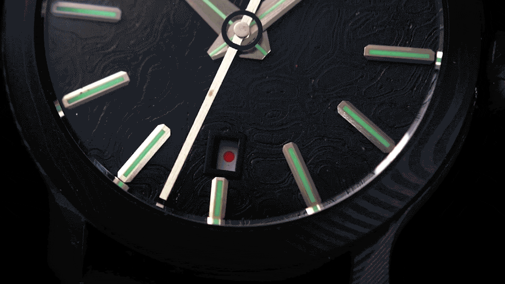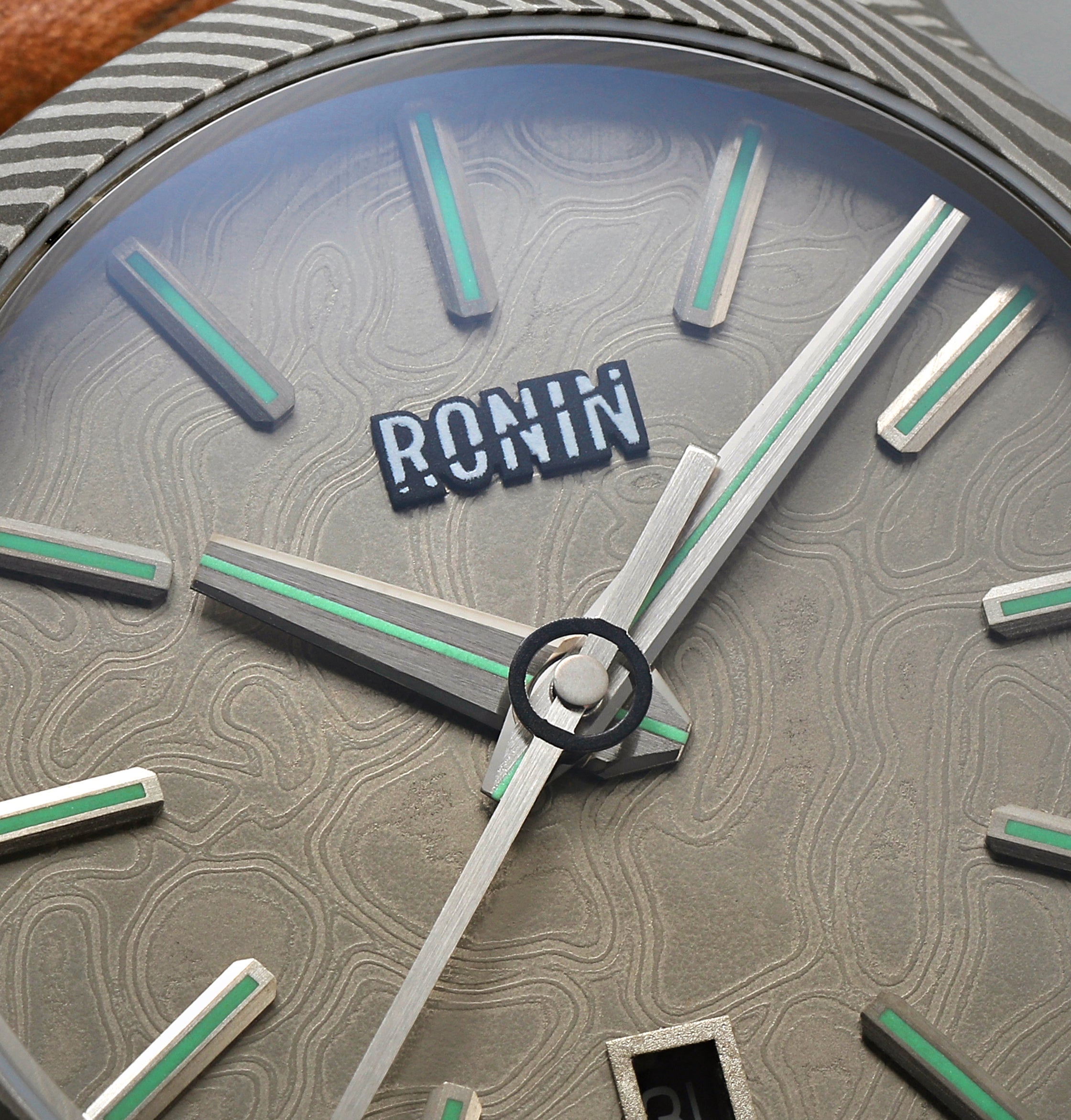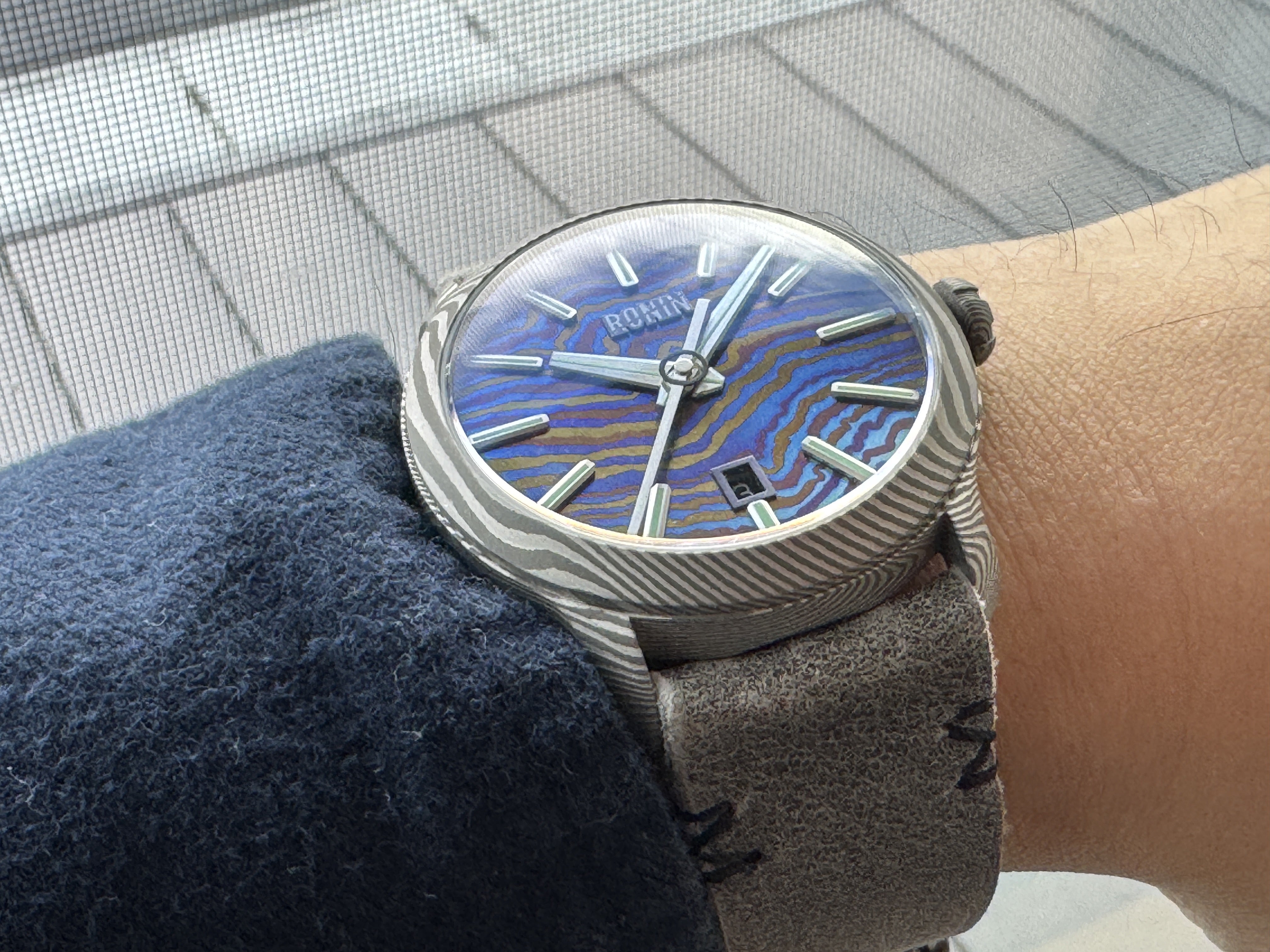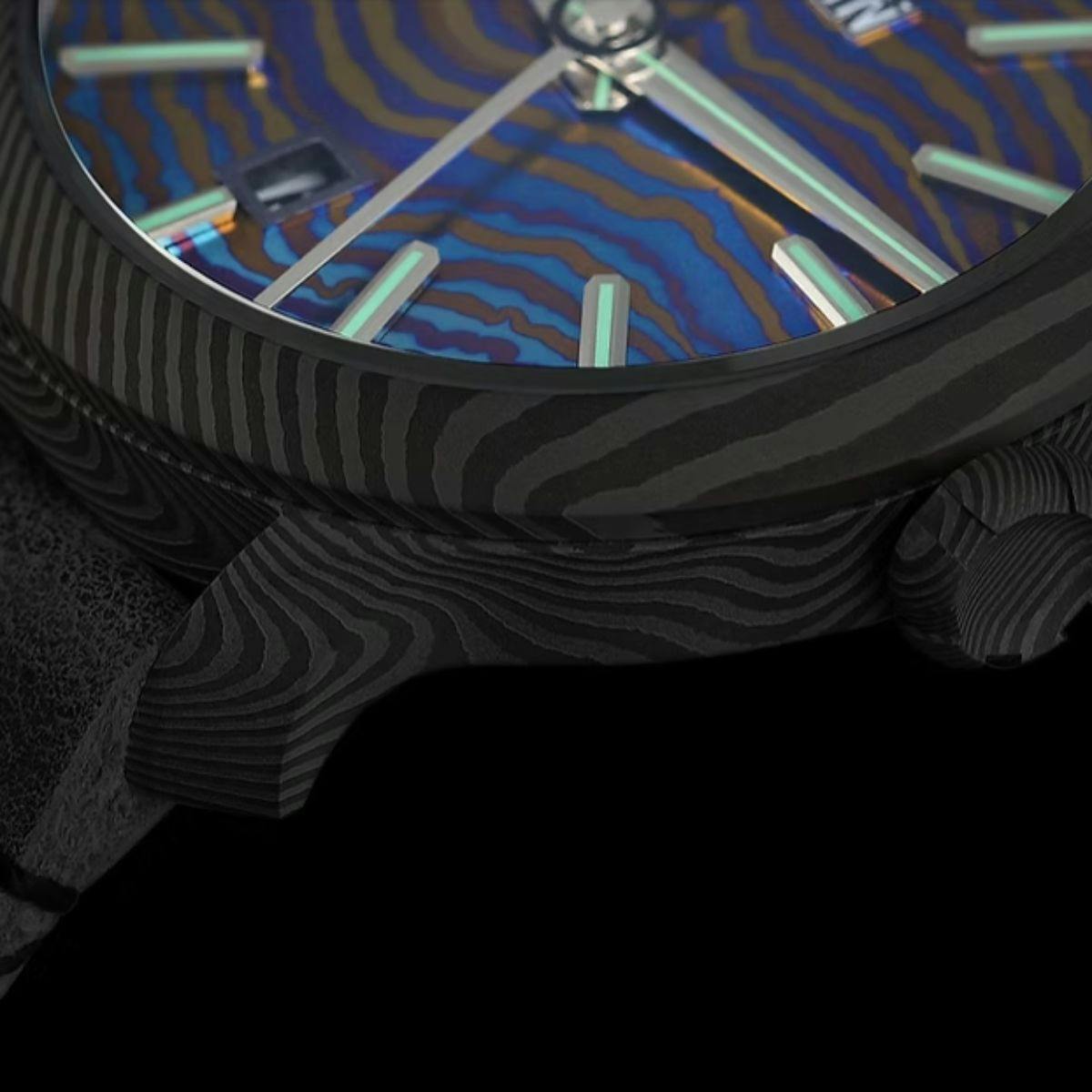 RONIN 02 の特徴のひとつとして、文字盤にティマスカス(Timascus)素材を使用し、ケースにはダマスカス鋼を組み合わせたデザインです。この組み合わせにより、他にはない独特の表情が生まれます。