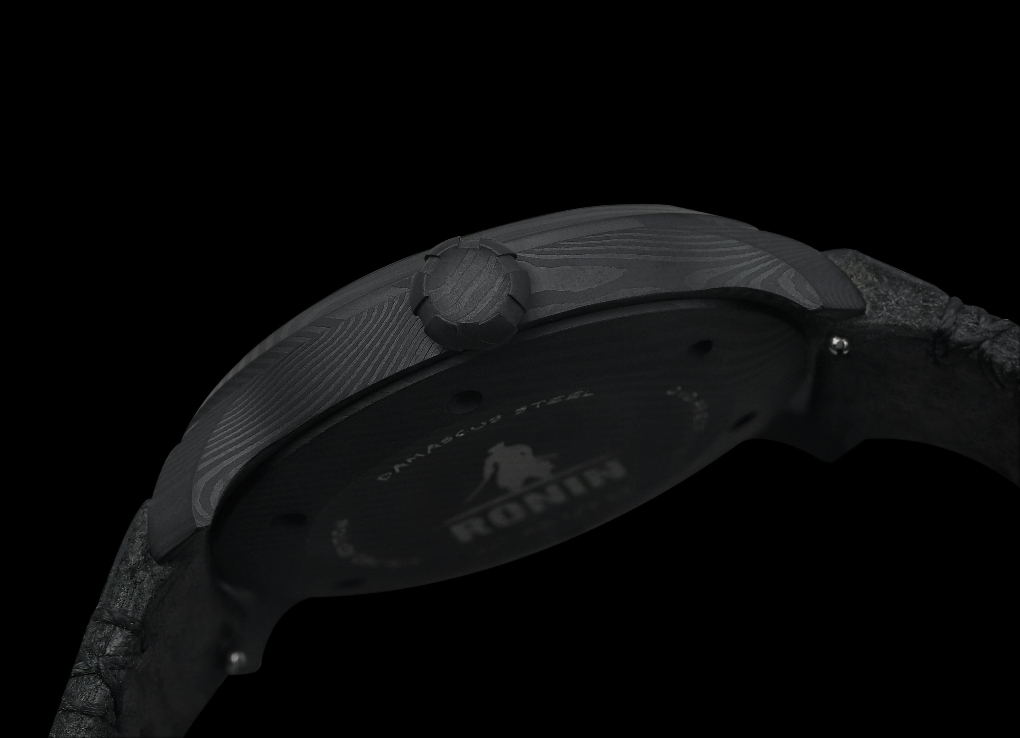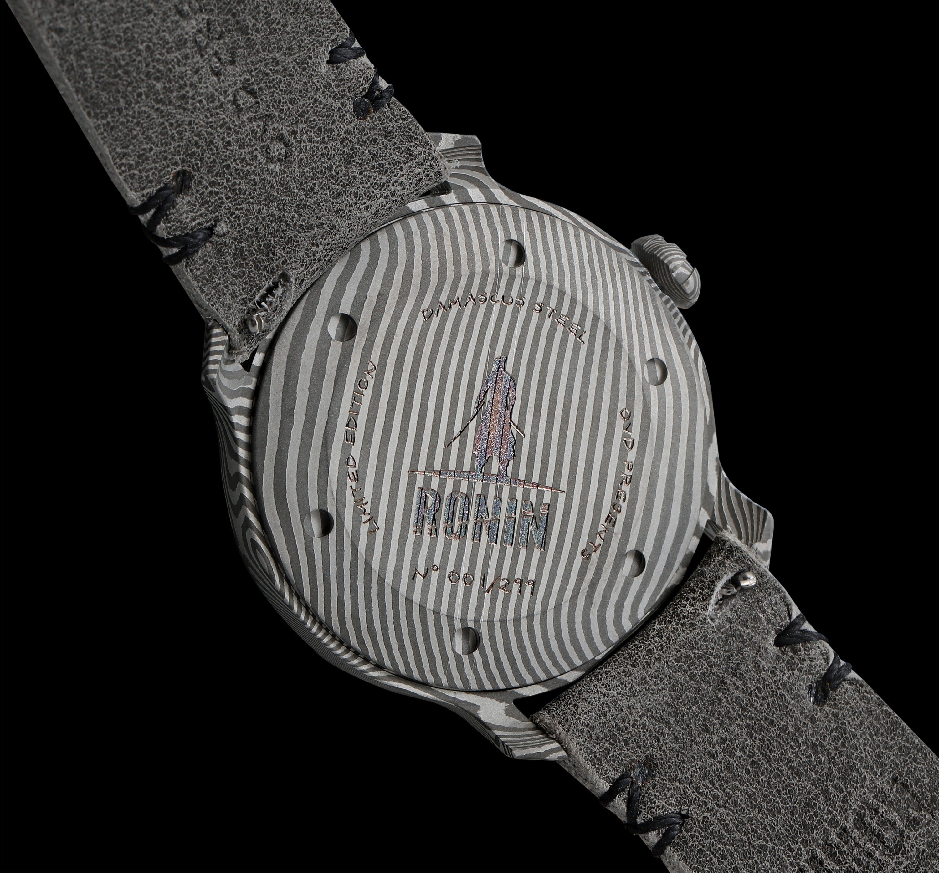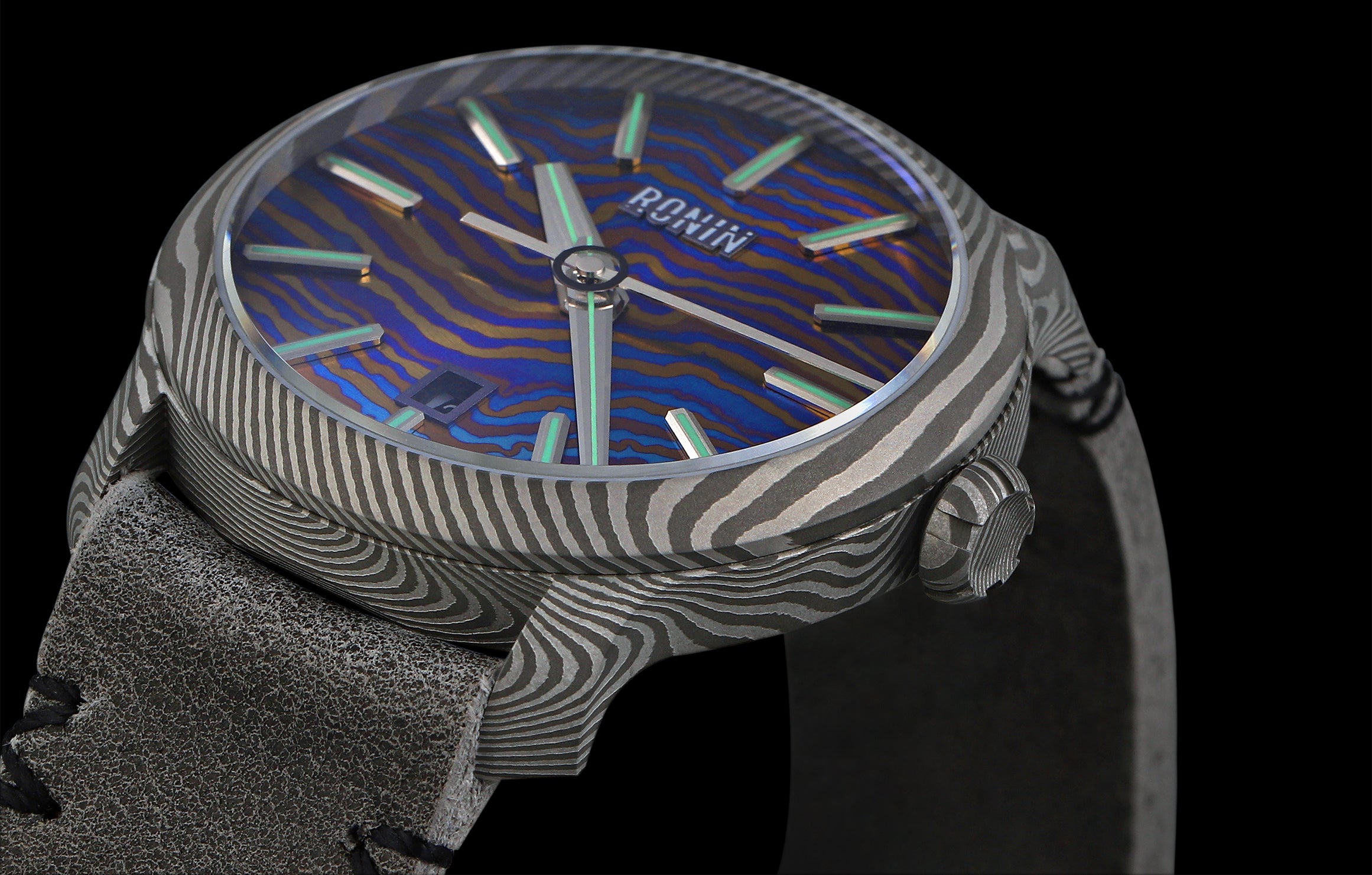 RONIN WATCHは、伝統的な日本刀の優美な職人技にインスパイアされ、唯一無二の模様を描くダマスカス鋼で仕立てられた腕時計です。