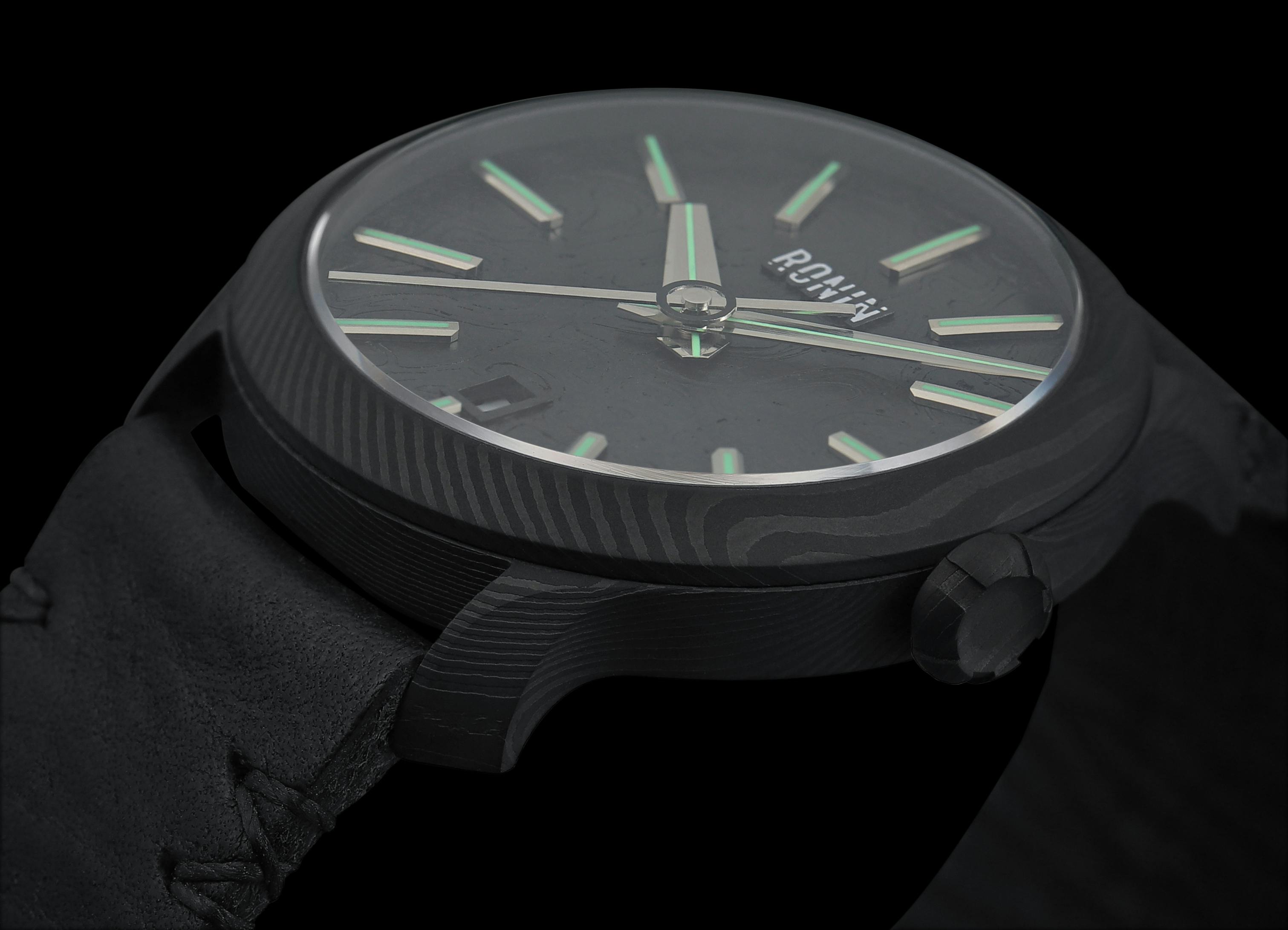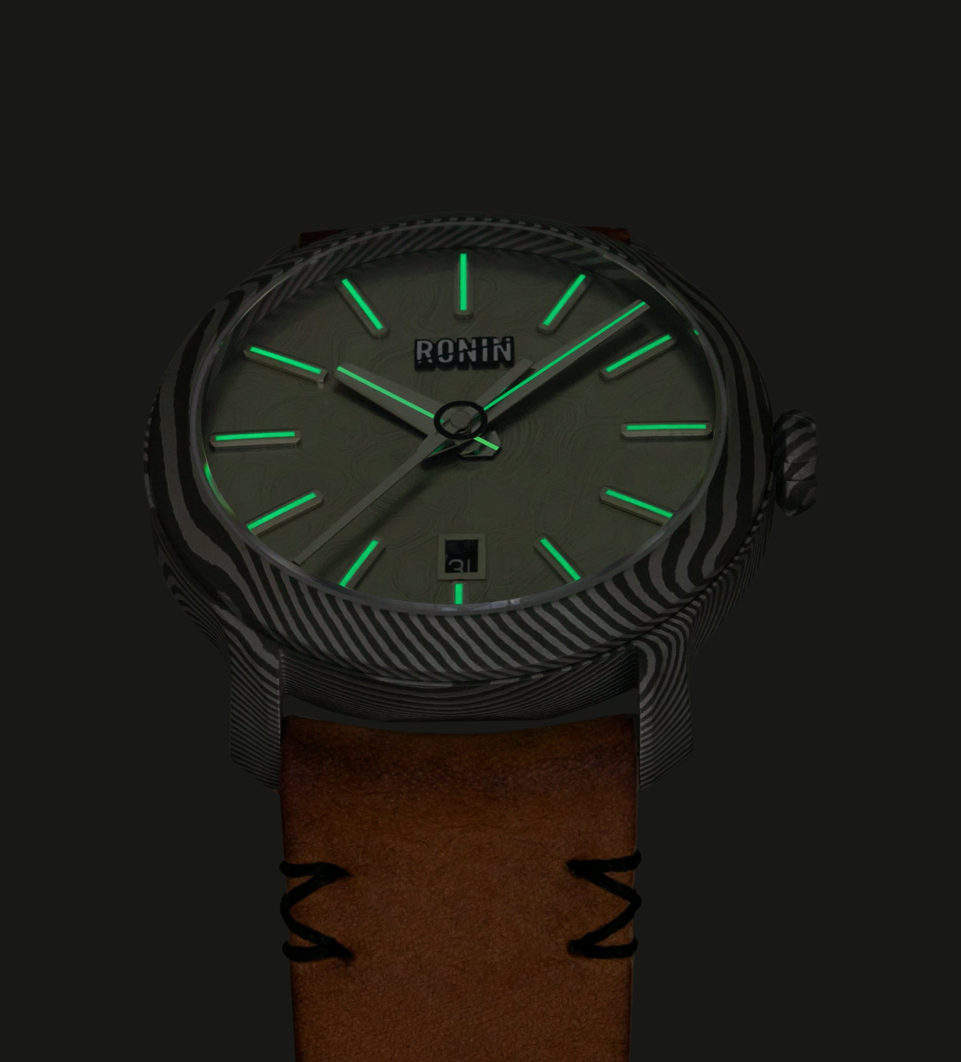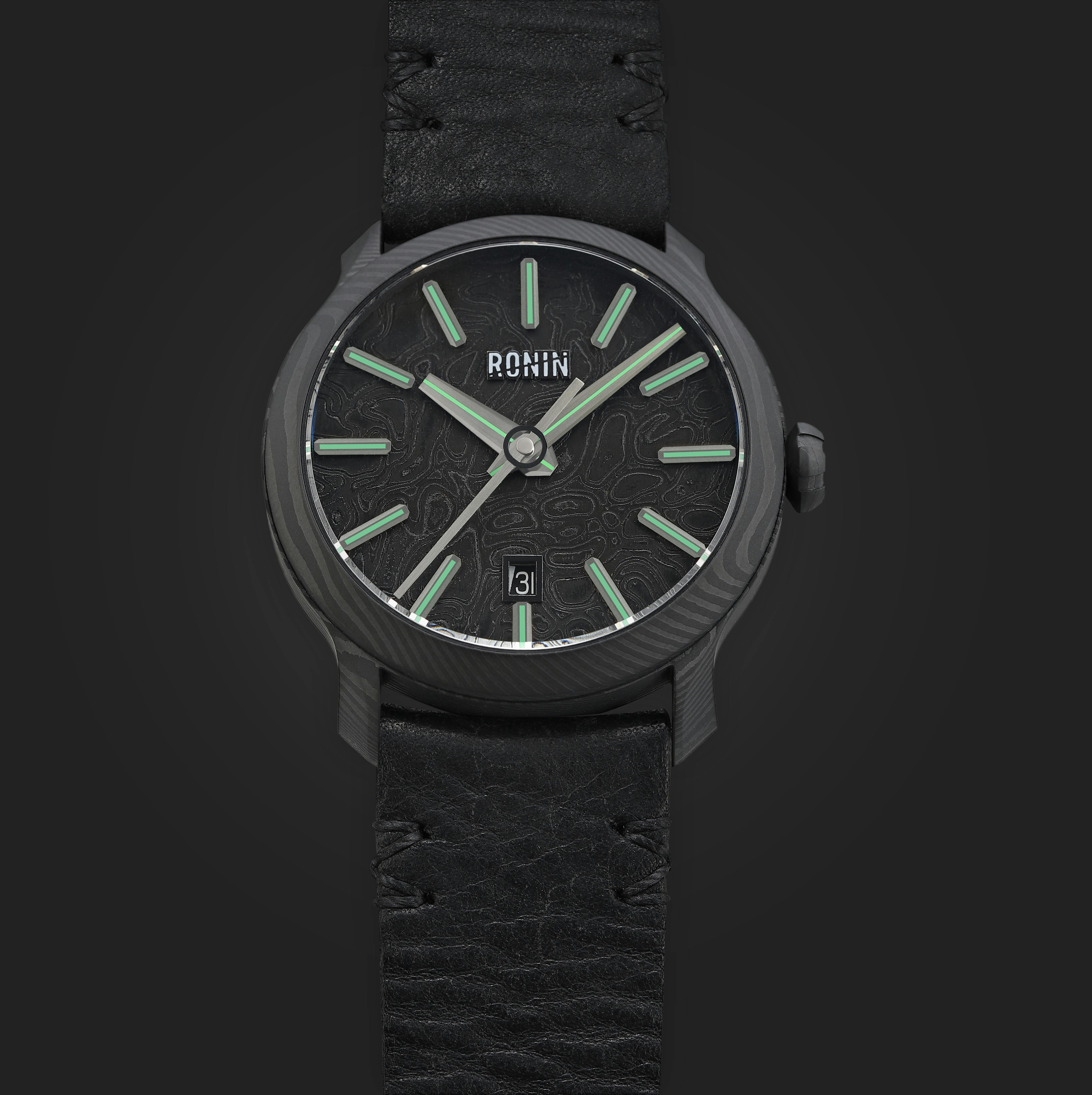 RONIN WATCHは、伝統的な日本刀の優美な職人技にインスパイアされ、唯一無二の模様を描くダマスカス鋼で仕立てられた腕時計です。